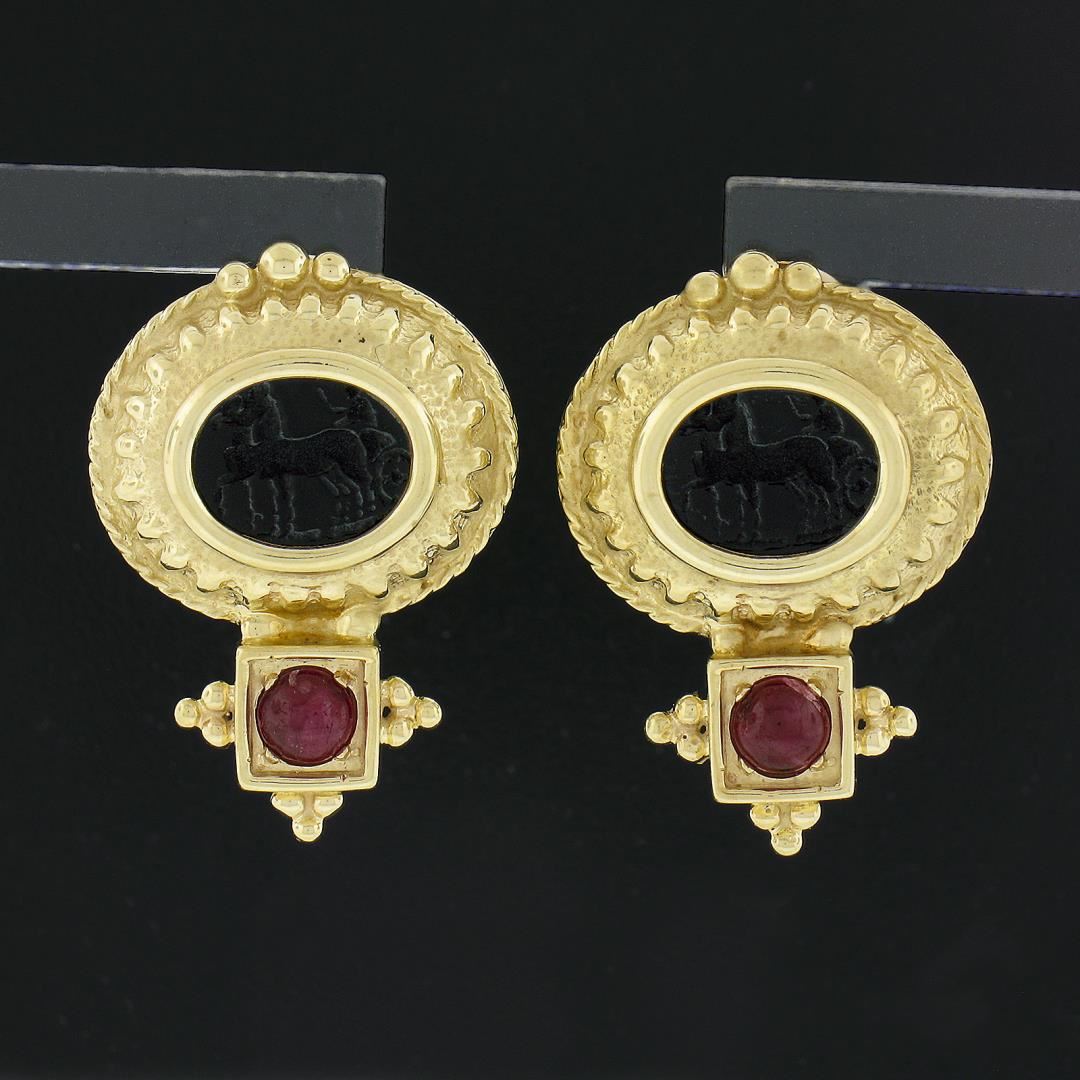 A solid 14k yellow gold drop earrings, with 2 oval intaglio natural black onyx (8.8x6.9mm each ), and 2 round cabochon cut natural rubies (4mm each). The earrings measure approximately 25.5x18.1mm and weigh a total of 10.17 grams.
