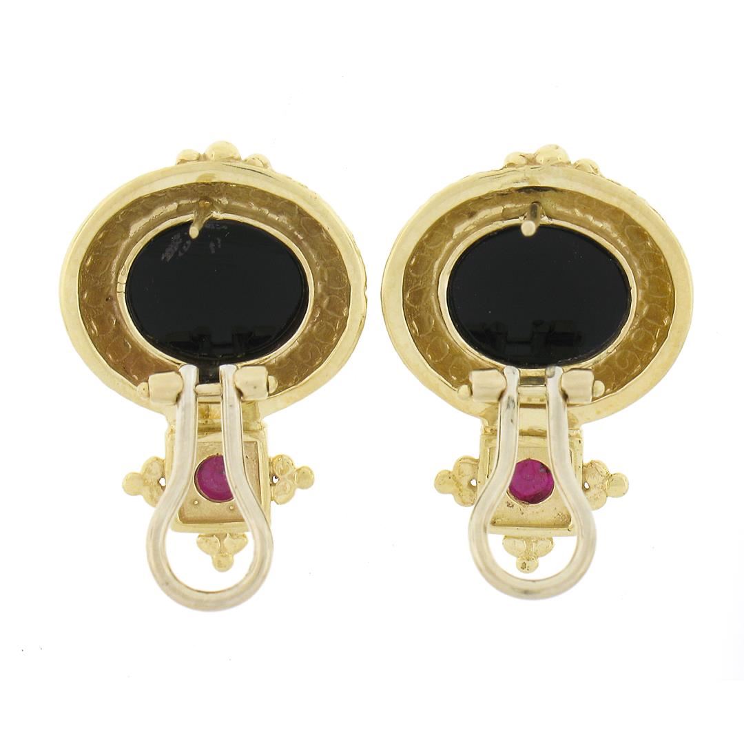 A solid 14k yellow gold drop earrings, with 2 oval intaglio natural black onyx (8.8x6.9mm each ), and 2 round cabochon cut natural rubies (4mm each). The earrings measure approximately 25.5x18.1mm and weigh a total of 10.17 grams.
