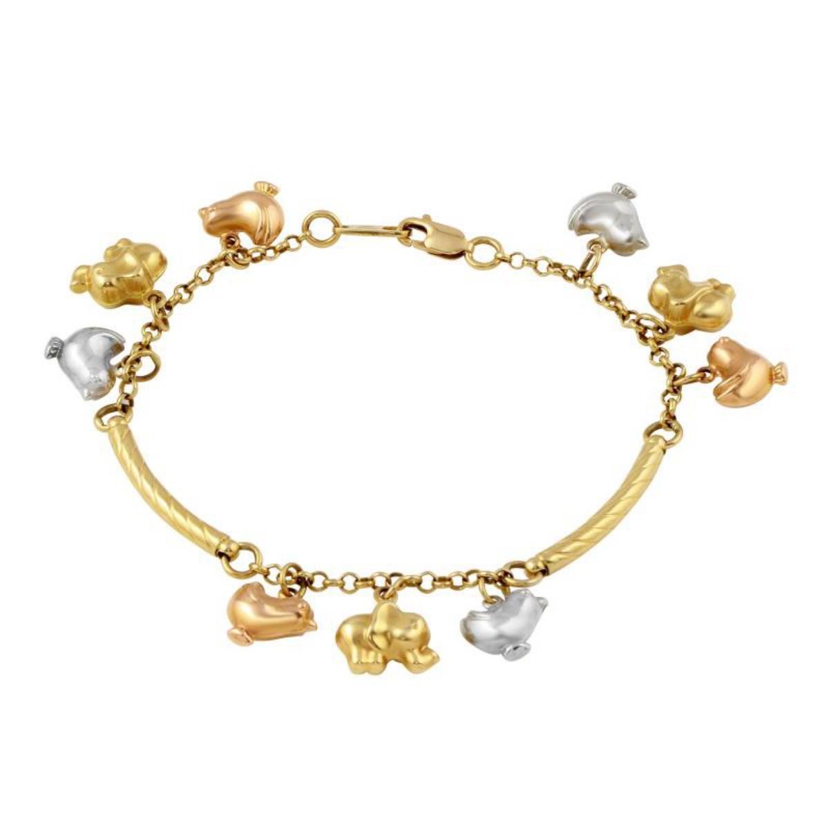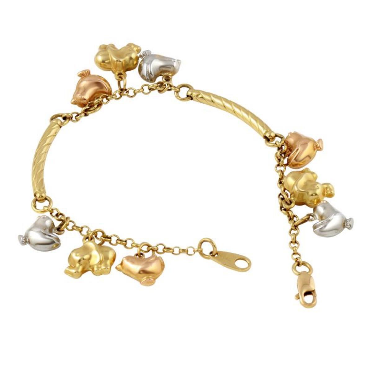 This adorable brightly polished 14k gold bracelet has a total of nine dangling puffed animal charms including roosters and elephants in various tones of gold strung on a rolo link chain. These little cuties alternate in between curved bar links with twisted engraved detailing for added shimmer. Bracelet measures 8 inches long and closes with a lobster claw clasp for your convenience. MADE IN ITALY. Total weight: 12.10 grams. Reference #: 233713