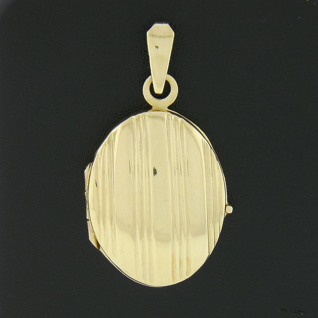 A solid 14k yellow gold italian oval locket pendant. The pendant weighs a total of 7.05 grams, measures 37.85x21.20mm including the bail, and the inside of the bail measures 7.50x3.15mm.