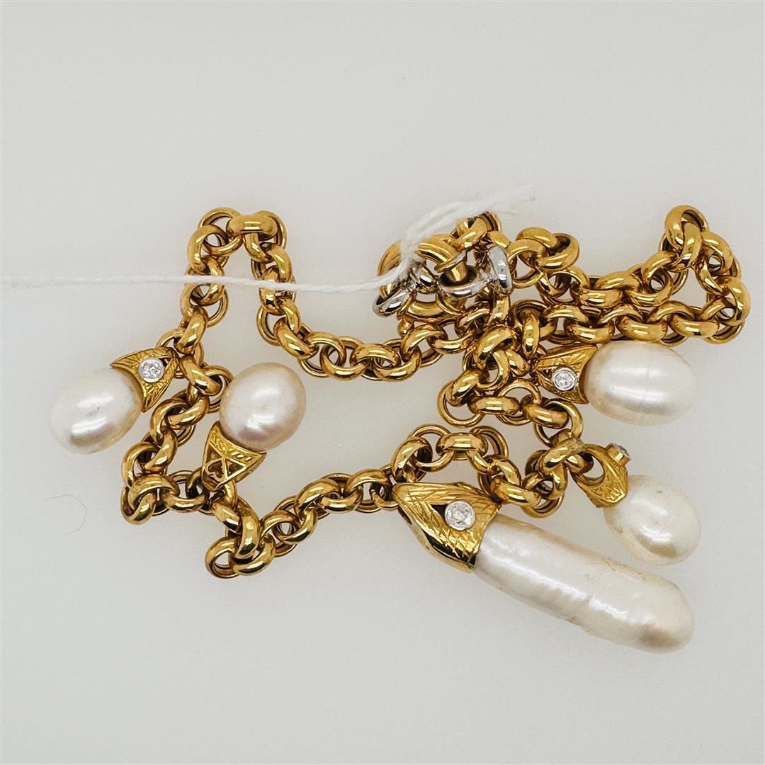 Italian 18k yellow and white gold designer necklace with four teardrop pearls single elongated baroque pearl, clasp marked 750 ITALY; gross weight 46.5 g, the largest pearl 1 1/2", the chain 15 1/2" (approx.)