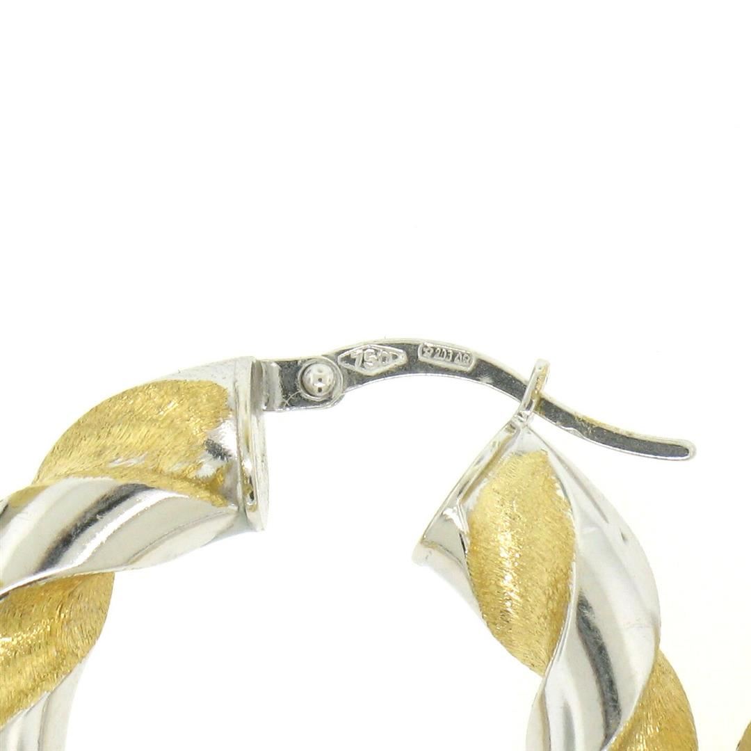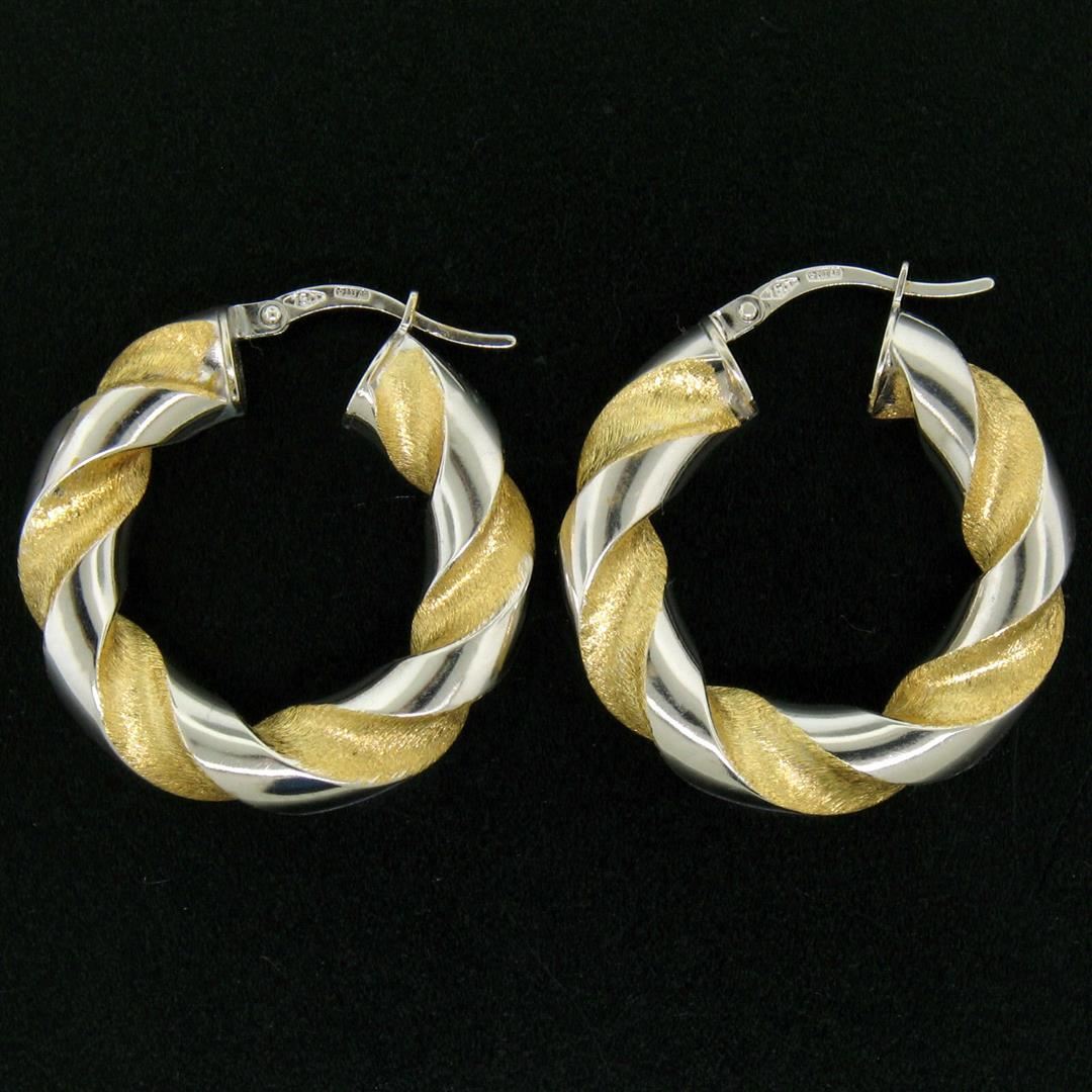 One Italian 18K Two Tone Gold 27mm Textured Twisted Drill Bit Pattern Hoop Earrings. Item Details: Material: 18K Solid Yellow & White Gold, Weight: 5.20 Grams, Backing: Snap Closures (pierced ears are required), Width: 27.40mm, Height: 29.35mm, Tube Thickness: 5.90mm, Hallmarks: , Condition: Like New!
