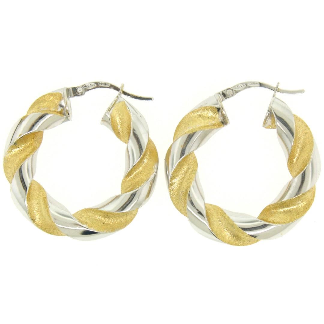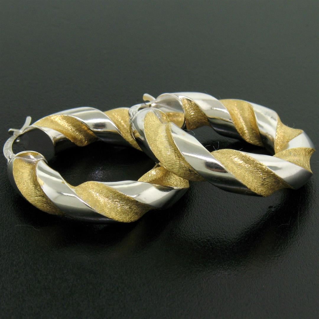 One Italian 18K Two Tone Gold 27mm Textured Twisted Drill Bit Pattern Hoop Earrings. Item Details: Material: 18K Solid Yellow & White Gold, Weight: 5.20 Grams, Backing: Snap Closures (pierced ears are required), Width: 27.40mm, Height: 29.35mm, Tube Thickness: 5.90mm, Hallmarks: , Condition: Like New!