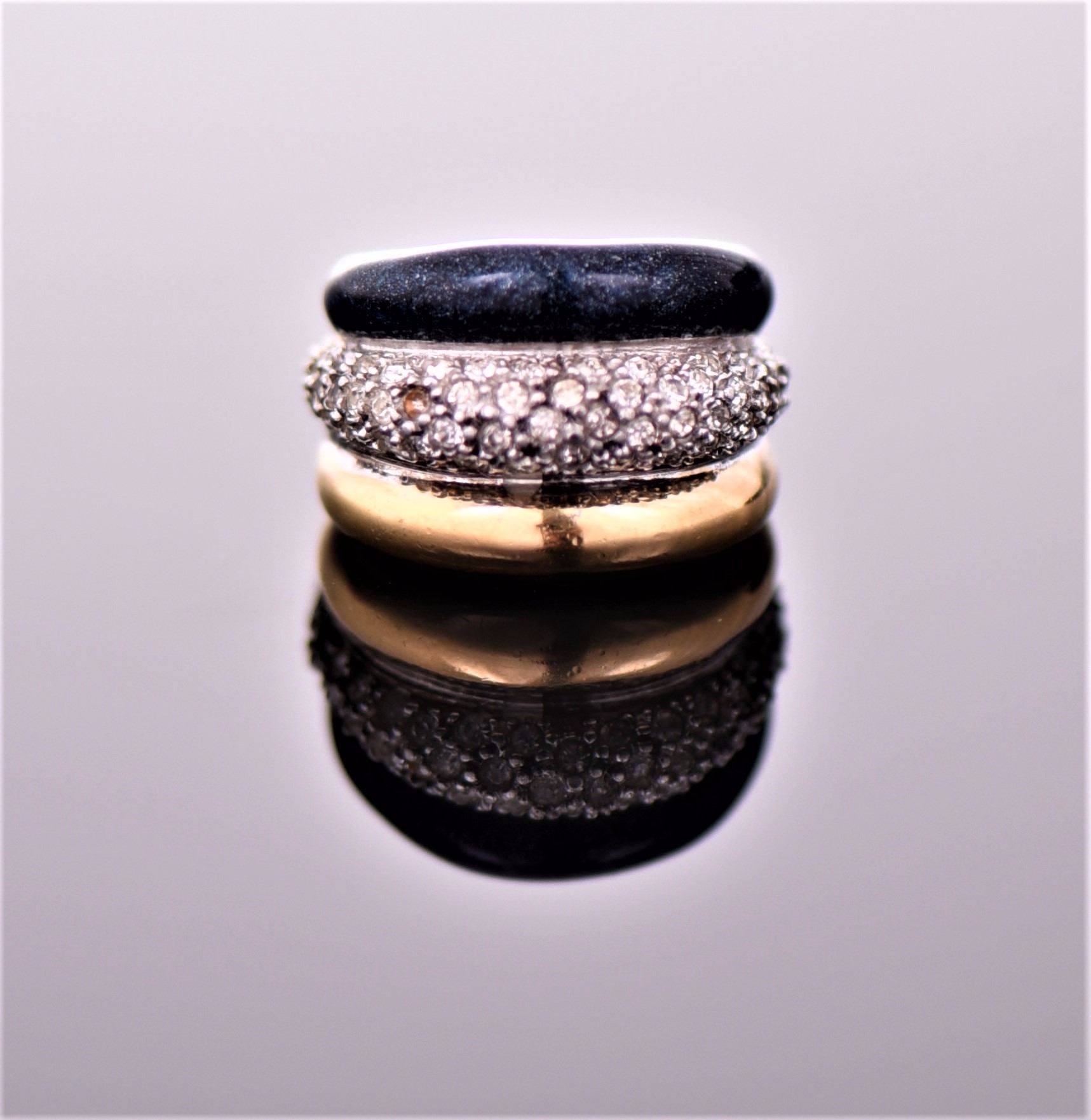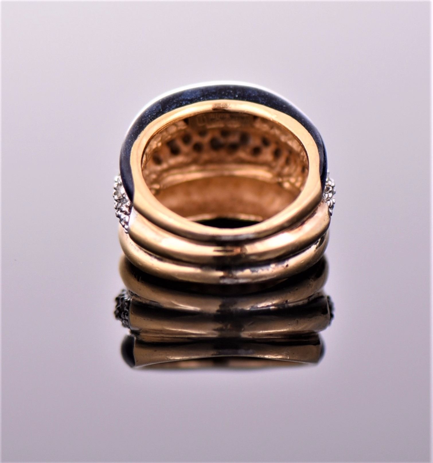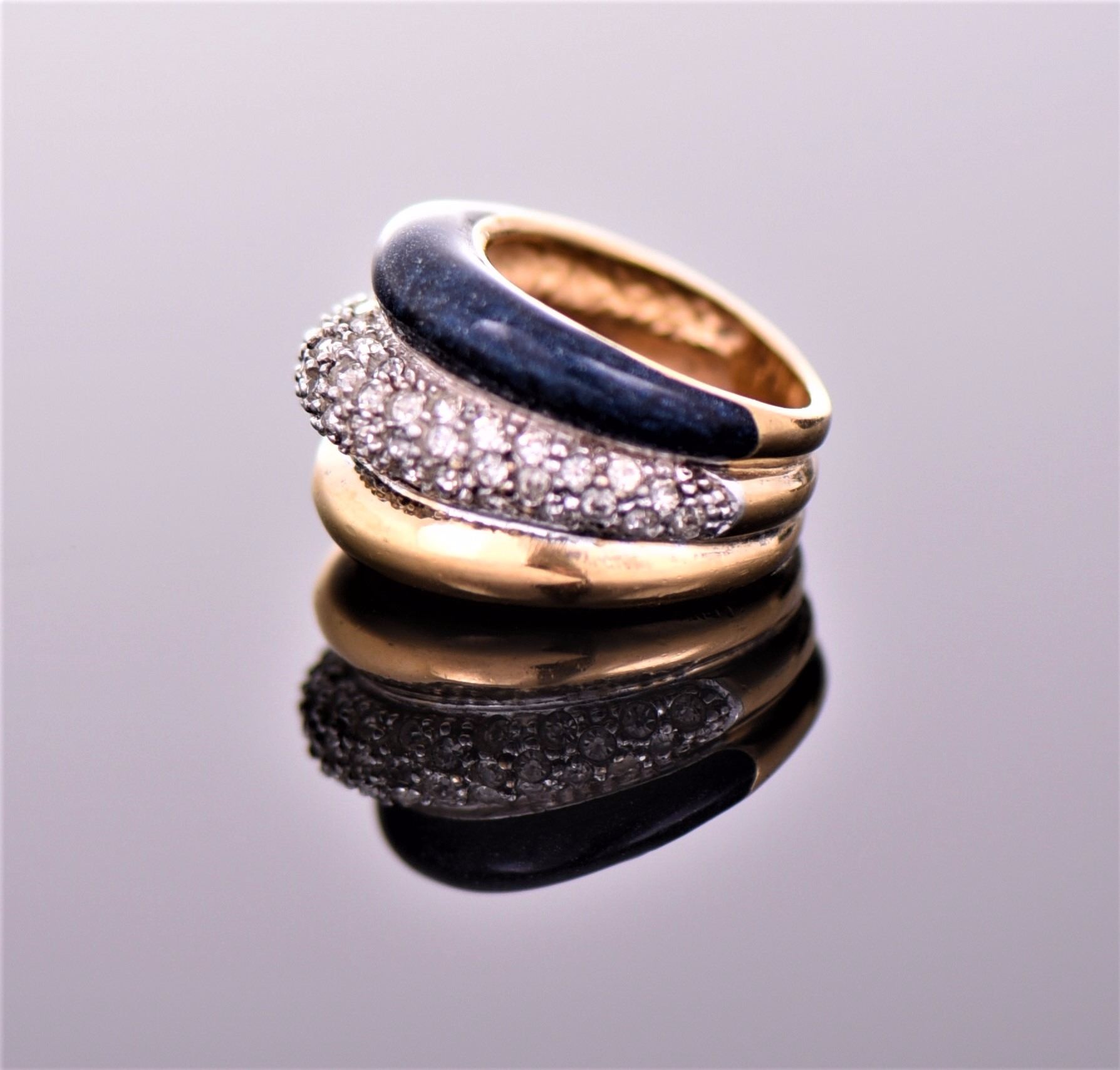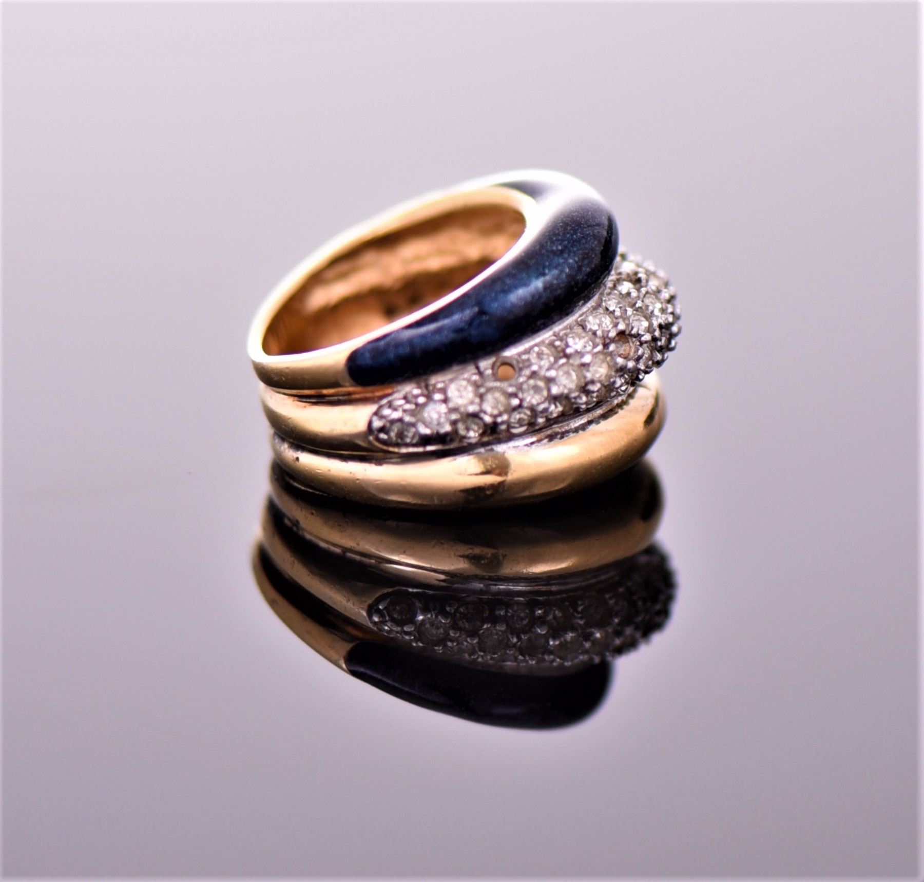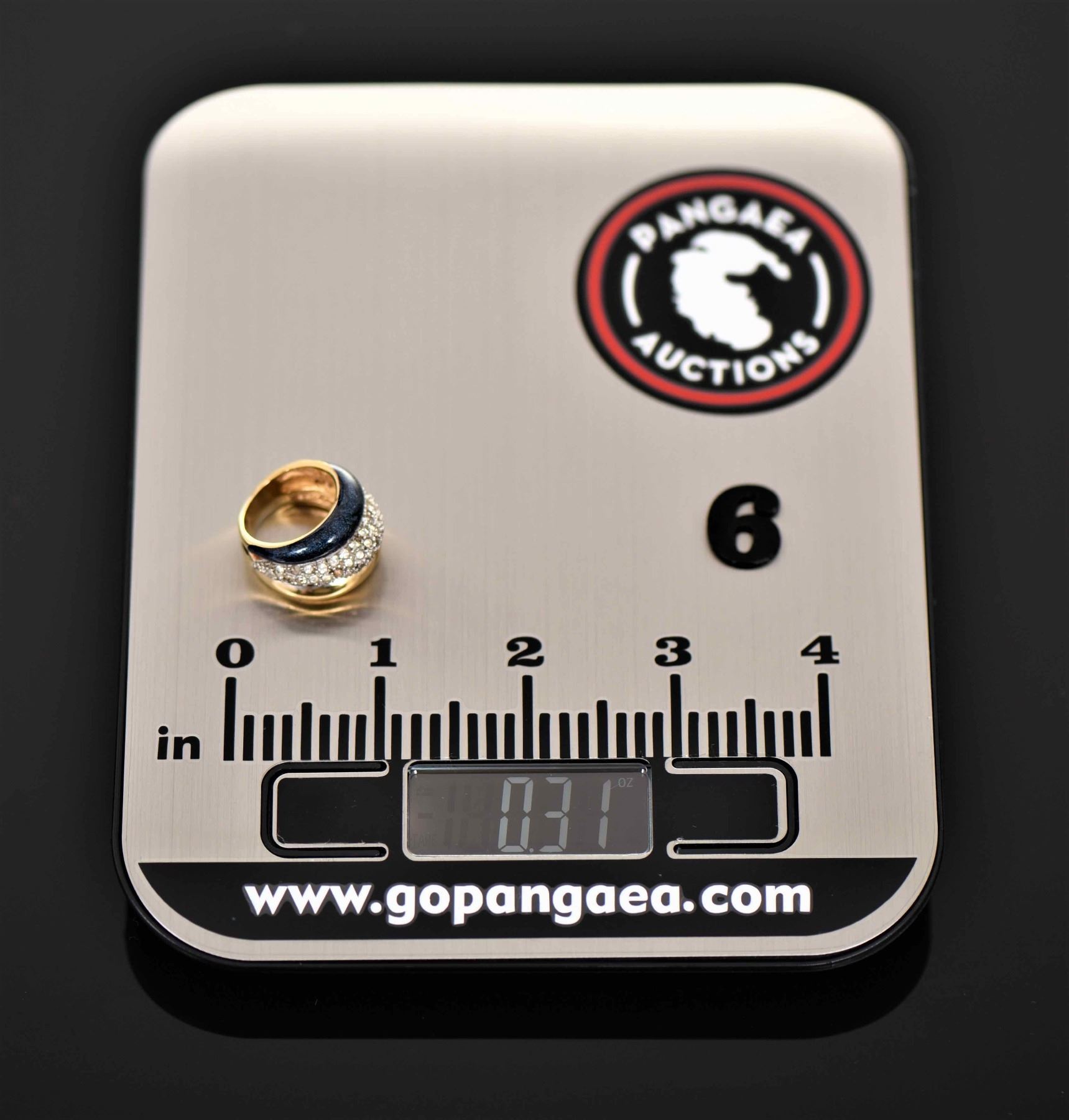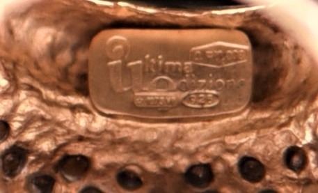 Italian 18k Gold Plate Over Sterling Silver Ring by Ultima Edizione, Italy. Made With CZ Diamonds And Blue Stardust Enamel. Ring Size 6. Estimated less than 50 yrs. old. 925 Sterling Silver consisting of 92.5% silver and 7.5% copper. Tested Positive using Nitric Acid Chemical Scratch Test, Cloth Rub Test, Smell Test, and Magnet Test. Markings of 925 or Sterling stamp. The reason silver needs to be combined with other metals is that it is very difficult to make great designs with just pure silver, which is very soft and malleable. A bit of hardness has to be introduced by adding other metals such as copper. That is why jewelers are capable of making the most intricate an complex designs with 925 Sterling Silver. Silver is one of the most valuable elements next to gold. Mexico is the leading producer of sliver, followed by the United States, Canada, Australia, Spain, Peru, and Russia. Many countries do not require their precious metal items to be stamped and therefore we test to ensure we accurately represent the product. Size and/or Weight: See Measurement Photo. (Photos Represent The Lot Condition, Pangaea Auctions)