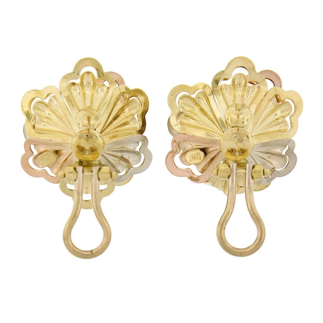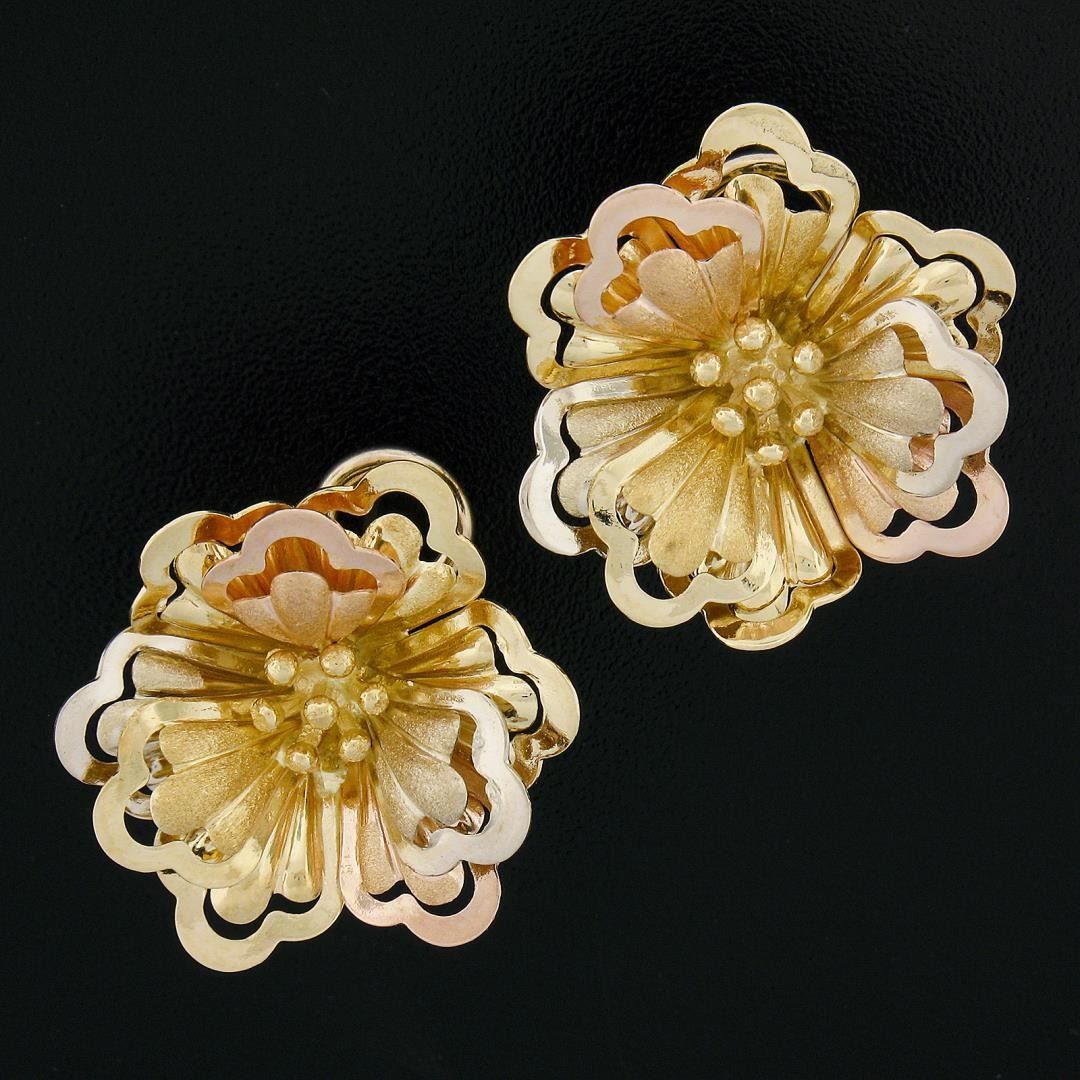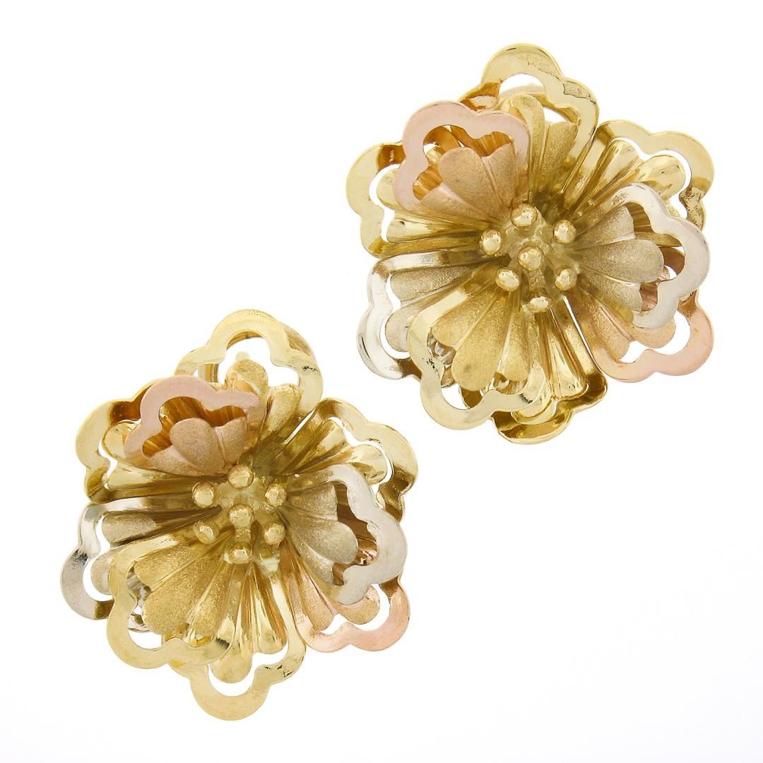 A solid 18k rose, yellow & white gold flower earrings. The earrings measure approximately 24.1x20.3mm and weigh a total of 9.54 grams.