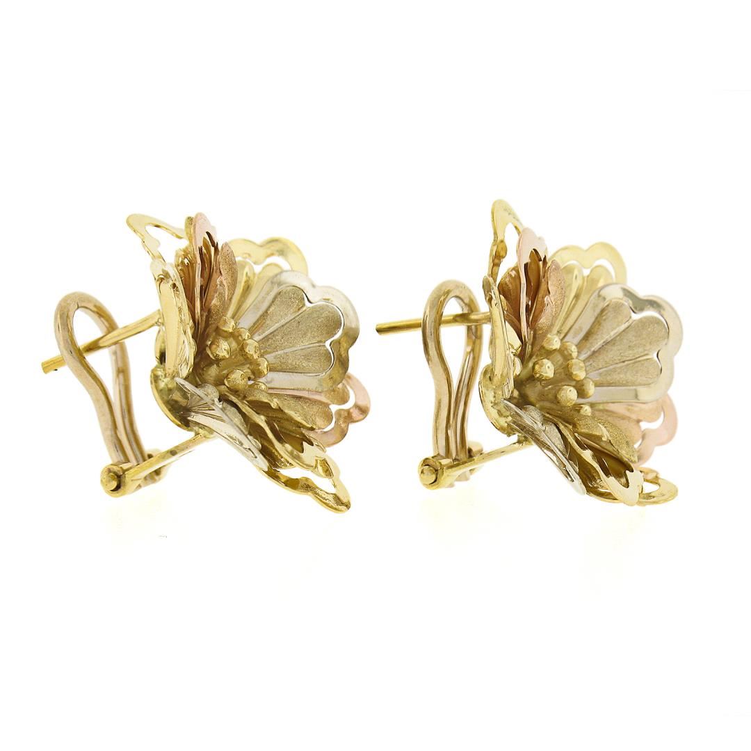 A solid 18k rose, yellow & white gold flower earrings. The earrings measure approximately 24.1x20.3mm and weigh a total of 9.54 grams.