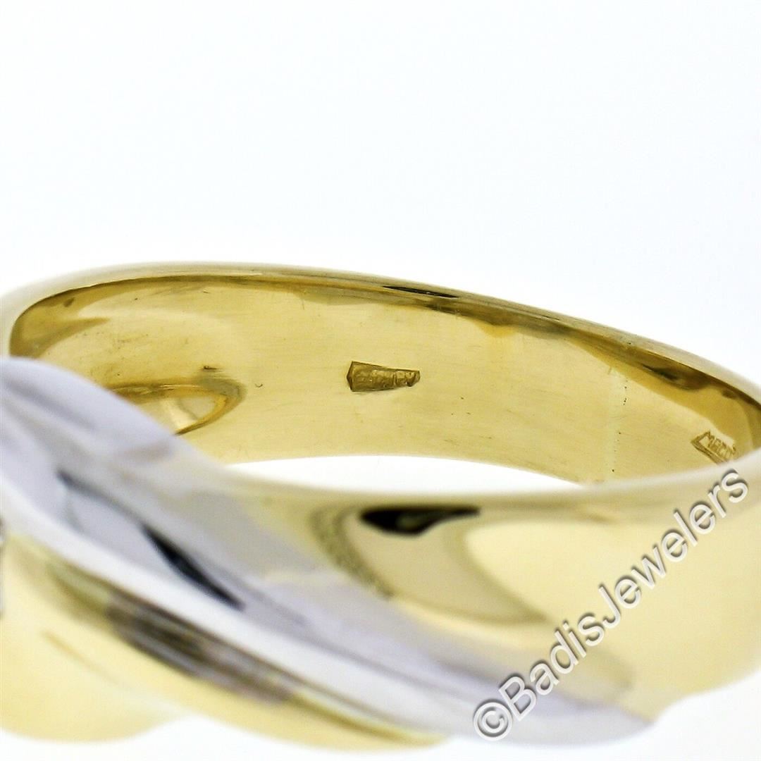 A like new Italian-made 18kt yellow and white gold band ring bezel set with a 0.36ct round diamond (H - VS2). The ring is size 9, weighs a total of 7.84 grams, and measures approximately 9.5mm wide.