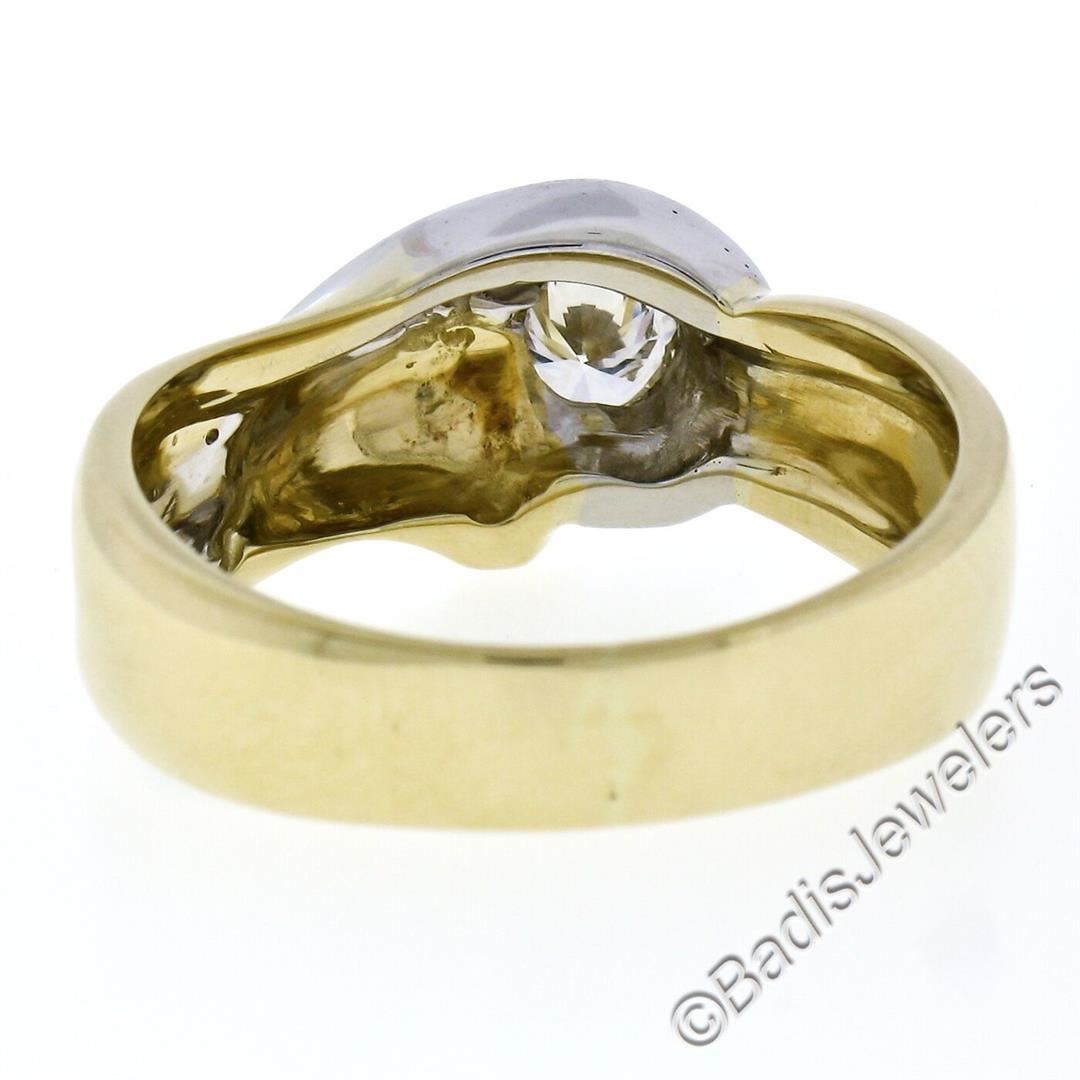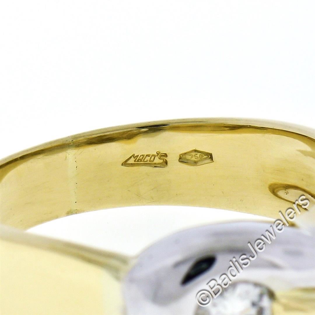 A like new Italian-made 18kt yellow and white gold band ring bezel set with a 0.36ct round diamond (H - VS2). The ring is size 9, weighs a total of 7.84 grams, and measures approximately 9.5mm wide.