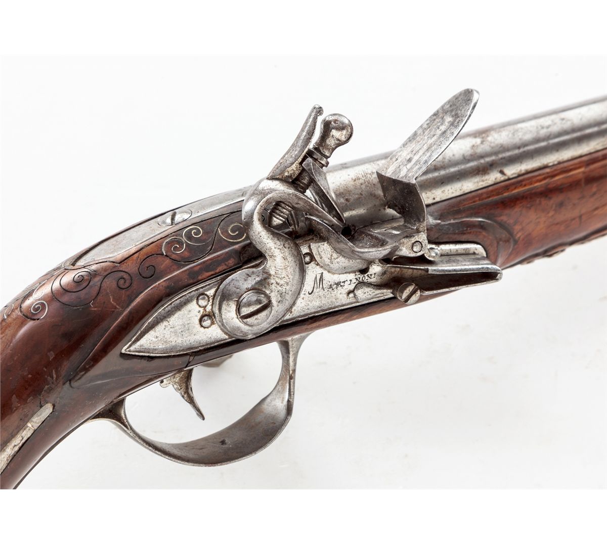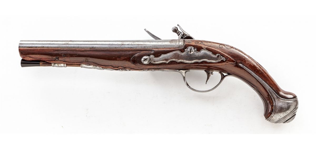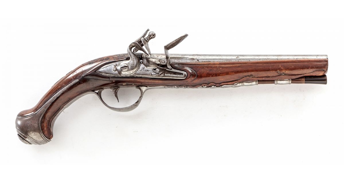 Beautiful Italian Late 18th-Early 19th Century Flintlock Pistol, by Martinoni, .69 cal., 8-1/4'' barrel, bright finish, wire inlaid fruitwood stock, bright triggerguard, pommel, sideplates, and ramrod receptacle. An elegant and finely made Northern Italian flintlock. Original flash hole cleaner as butt pommel is retained. Condition is near excellent showing just light carbon spotting to bright parts, small losses to stock at forward left portion of pommel cap with some missing wire filigree work as well; repairs to forend beneath ramrod ferrule. Original horn-tipped rammer is present. Action remains in good working order. Est.: $1,200-$1,800. (Antique)