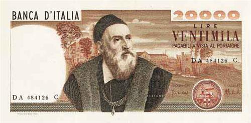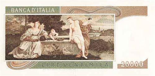 Cartamoneta - Repubblica Italiana - Biglietto di Banca da 20.000 Lire "Tiziano" - D.M. 21.2.1975 - Zecca: - Diritto: - Rovescio: - Estratto all'epoca da una mazzetta della Banca d'Italia