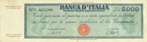 Repubblica Italiana - Titolo provvisorio da 5.000 Lire - D.M. 22.11.1949 Varie piegature - Da esaminare