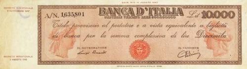 Repubblica Italiana - Titolo provvisorio da 10.000 Lire - D.M. 8.9.1947 Da esaminare