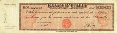 Repubblica Italiana - Titolo provvisorio da 10.000 Lire - D.M. 6.9.1949 Vari difetti fra cui uno strappo - Da esaminare
