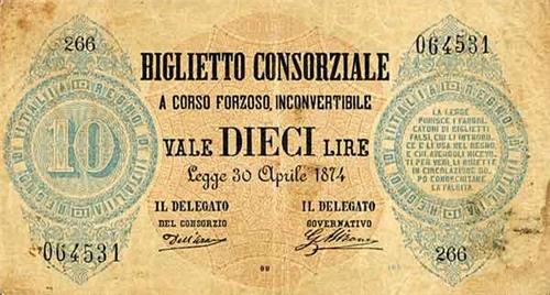 Italian Bankonotes - 10 L. 30/4/1874 - - Biglietto consorziale da 10 Lire - legge 30.4.1874 - Trace di circolazione, piega centrale e macchia Zecca: - Diritto: - Rovescio: - Da esaminare