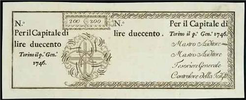 Italian Bankonotes - 100 L. 200 L. 1746 - - Biglietti di credito verso le Regie Finanze Zecca: - Diritto: - Rovescio: - Due biglietti non emessi 1.1.1746 rispettivamente da 100 e 200 Lire - Qualche macchia ma in generale di ottima qualità - Da esaminare