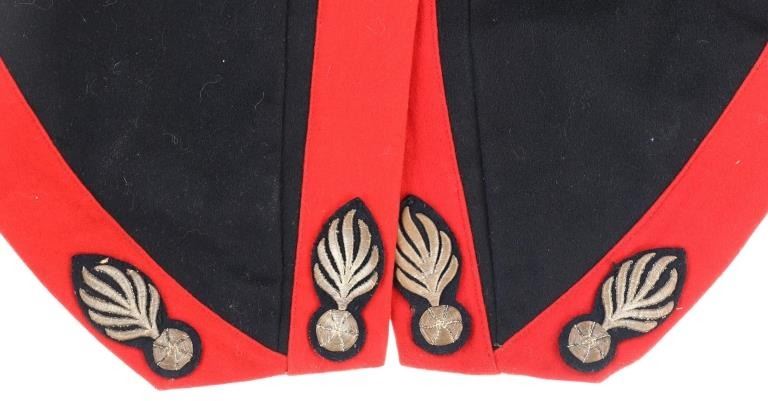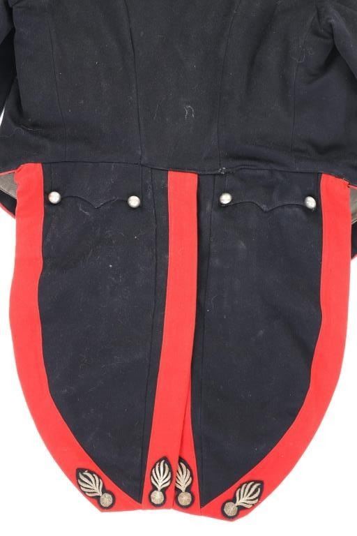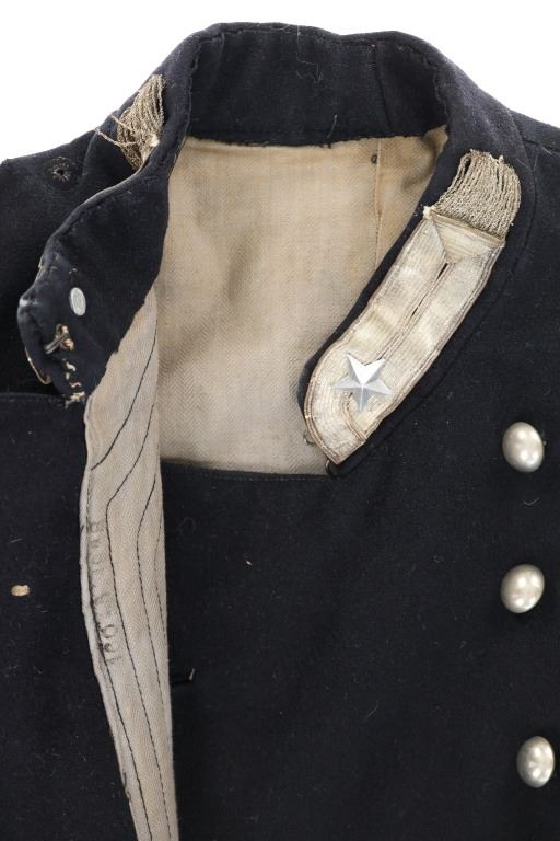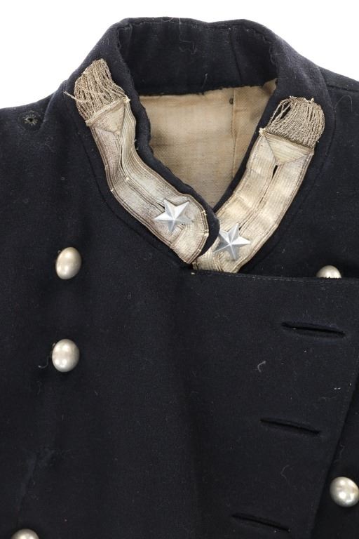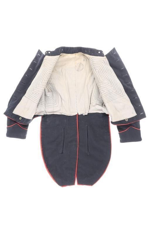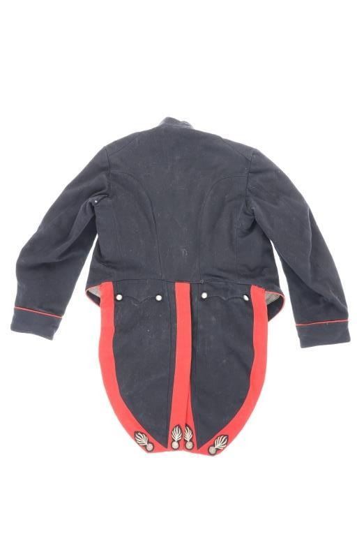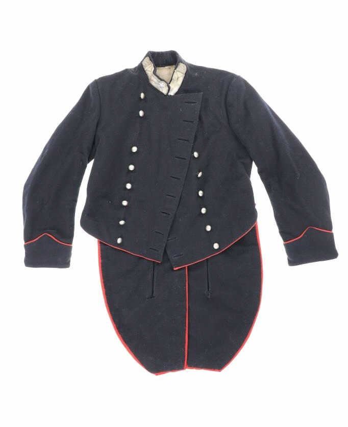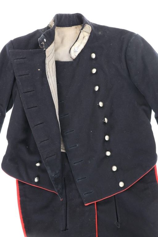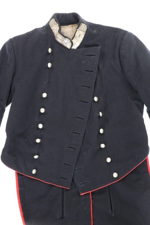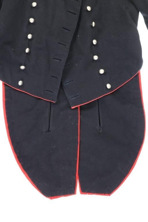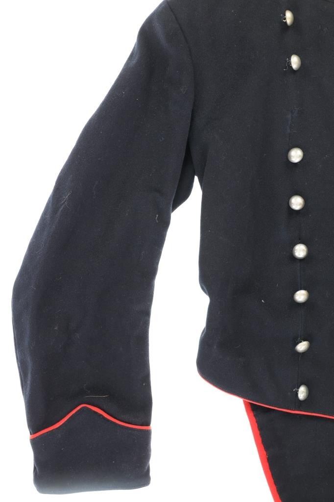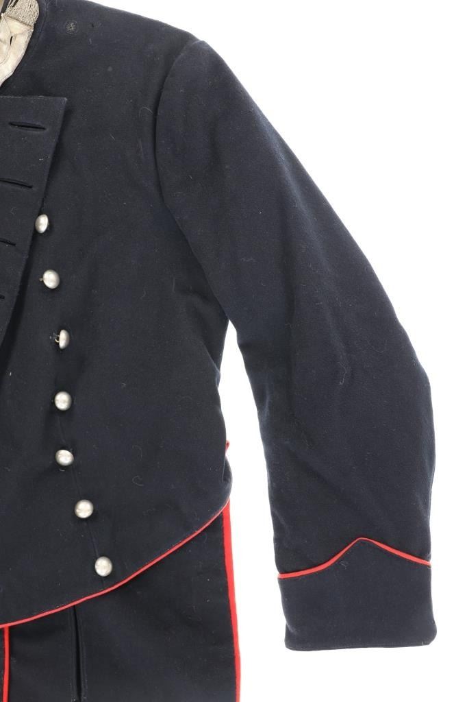 Offered in this lot is an Original Italian Carabinieri Dress Uniform Tunic Wool Jacket, circa post WWII period. The style is almost timeless and is essentially identical to that from earlier periods. The Carabinieri are a military police force, a Gendarmerie-like group governed by the Ministry of Defense, with military and civilian duties; while Polizia di Stato is similar to other civilian police forces and is governed by the Ministry of Interior. The carabinieri are actually older than Italy itself. Their force was founded by Victor Emanuel I, Duke of Savoy and King of Sardinia almost half a century before modern Italy came into existence. Their name comes from the carabina, the rifle they traditionally carried. The Carabinieri are often referred to as "La Benemerita" (The Reputable or The Meritorious) as they are a trusted and prestigious law enforcement institution in Italy. The first nine written rules about Tuscany uniforms for Carabinieri date back to 9 August 1814 and recite the first design of the uniforms. For historical and ceremonial use, the Carabinieri uniform consists of a distinctive black uniform made of silver braids around the collar and cuffs, edges trimmed in scarlet and epaulettes in silver. This ceremonial wool is in fair condition with previous repairs and light moth damage observed. All original metal buttons and braids, epaulettes removed. Scarlet trim still looks sharp! One of the interior buttons is labeled "Unione Militare", the name of a company specialized in the supply of uniforms and accessories for the Italian armed forces. Tunic size approximate is 34" chest, 15.5" collar/neck, 32" arm.