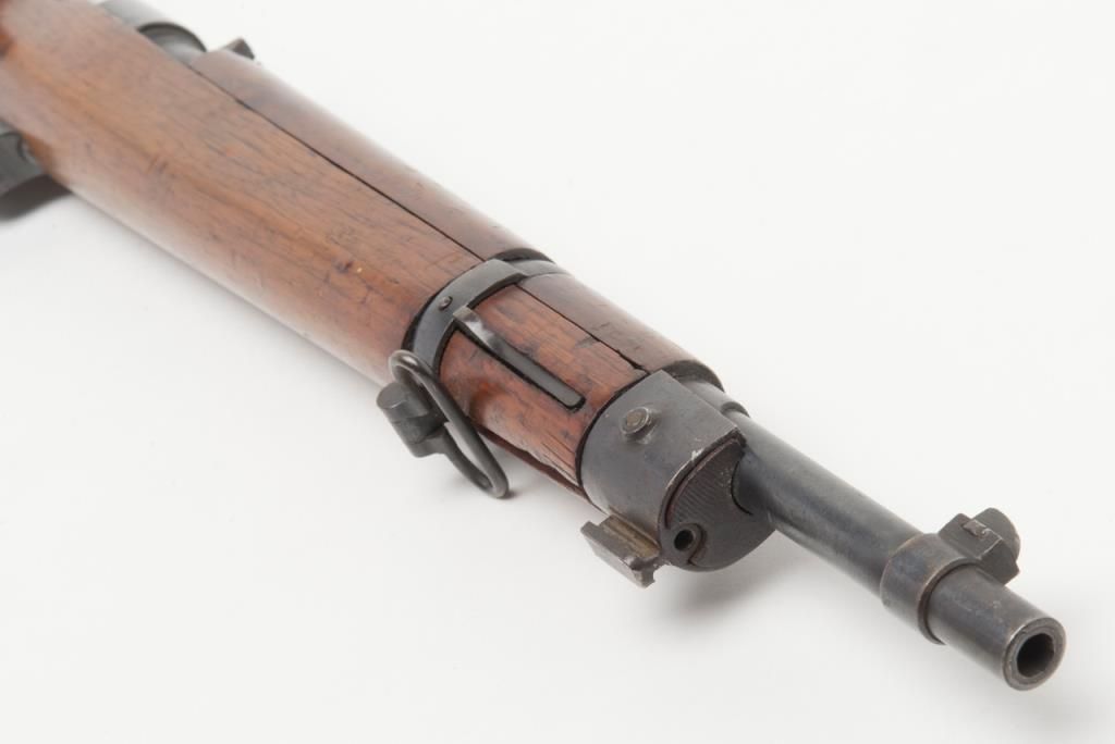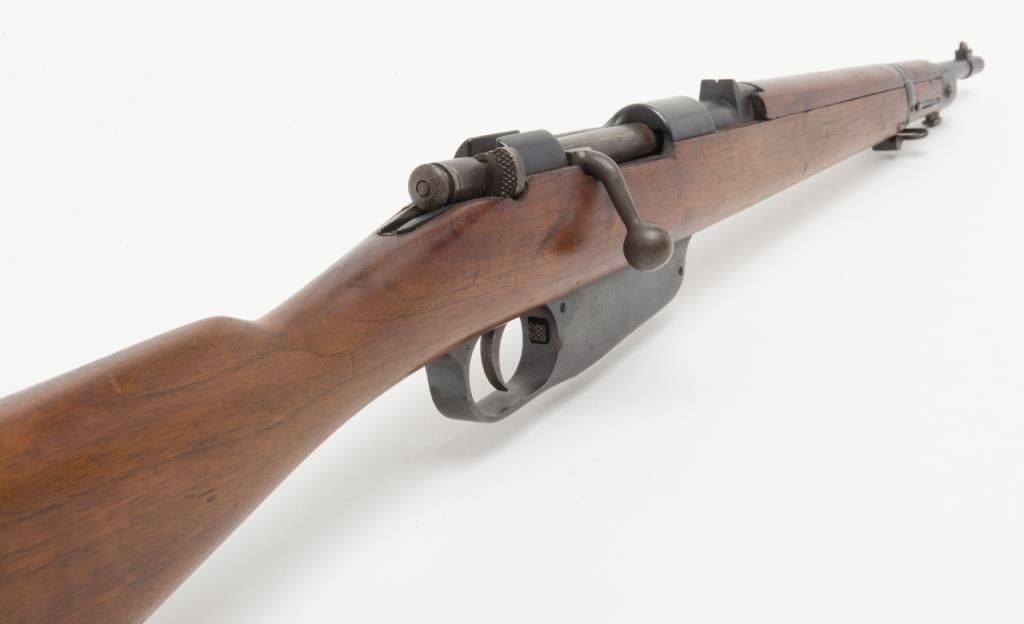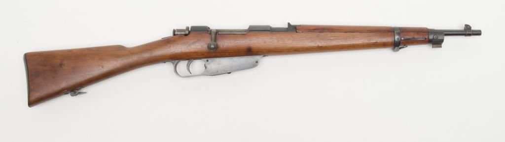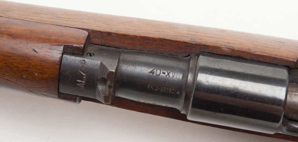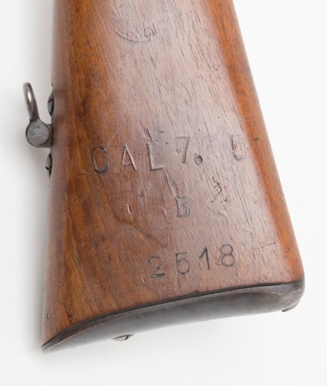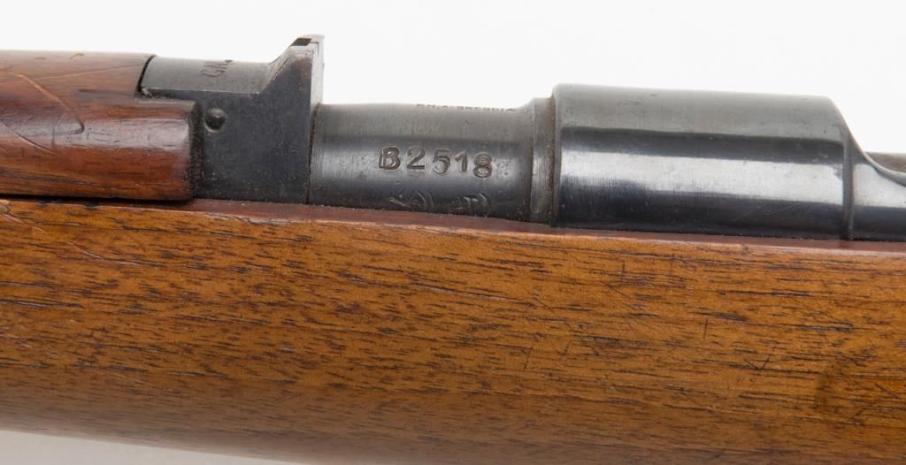 Italian Carcano bolt action rifle, caliber 7.35 mm, Serial #B2518. The rifle is in overall good condition with an 18” blued barrel. The rifle retains some original military finish while the action appears to have been re-blued. The rifleretains the bayonet lug, sling swivels and smooth metal butt plate. The bore is fair, action working and markings legible on this Carcano. (C+R/PPT). Est.: $125-$250.
