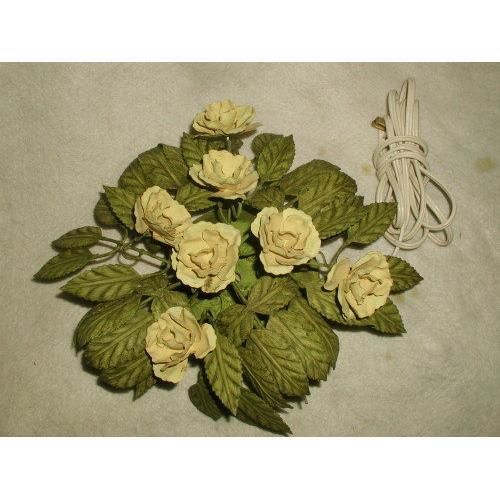 Unusual Italian metal hand painted ceiling fixture with 4 small based bulbs of various wattage,can also be used as a wall sconce. Wiring on plate easily attaches to a nail for wall hanging and has cord and plug or to be wired into the wall or ceiling. Seven large yellow metal roses on a bed of green veined and rippled rose leaves comprise the unit of this C.1920 piece. Wiring in wonderful shape and beautiful when lit as no bulbs show just light behind the roses. Excellent condition,no chips to the paint. Measures 6H X 13.5L X 13.5D.