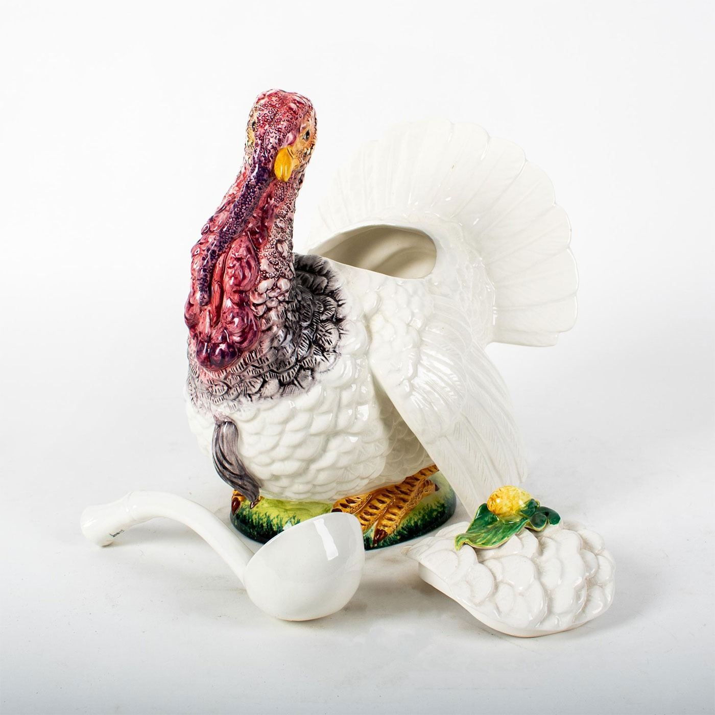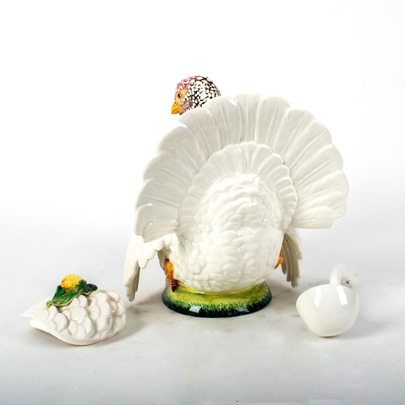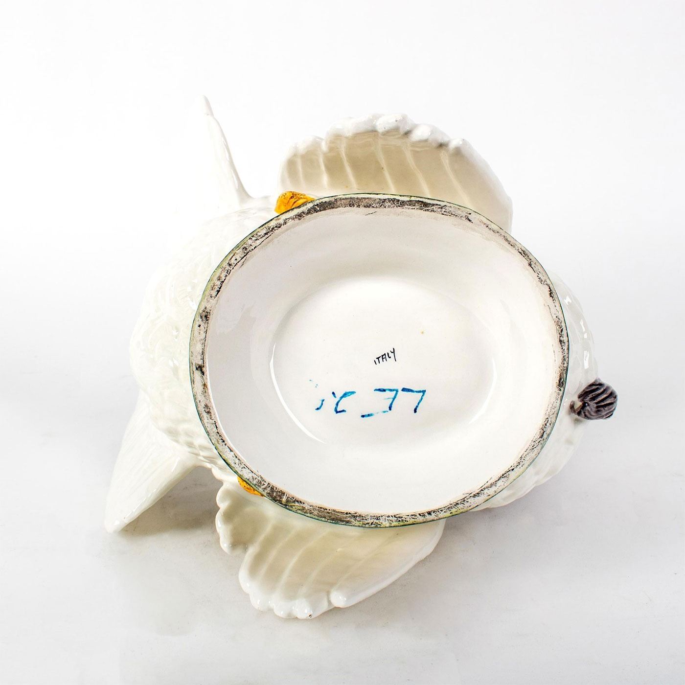 Highly detailed, life-like majolica turkey with lemon-topped lid. It has its white tail feathers spread with a realistic wattle and caruncles. Its beak is yellow as well as the claws which are resting on grass. Marked Italy on base.