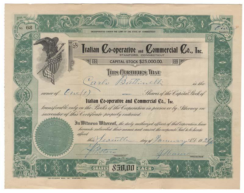 1924, Stamford, Connecticut. Certificate for 1 share. Green. Top left vignette of a n eagle. Uncancelled and fine some light toning.