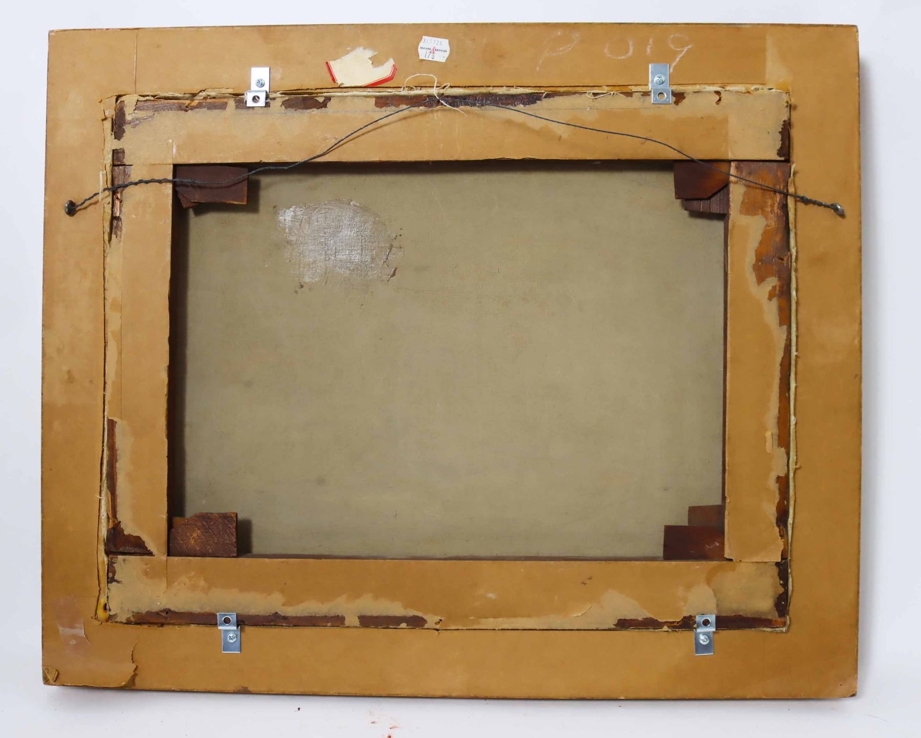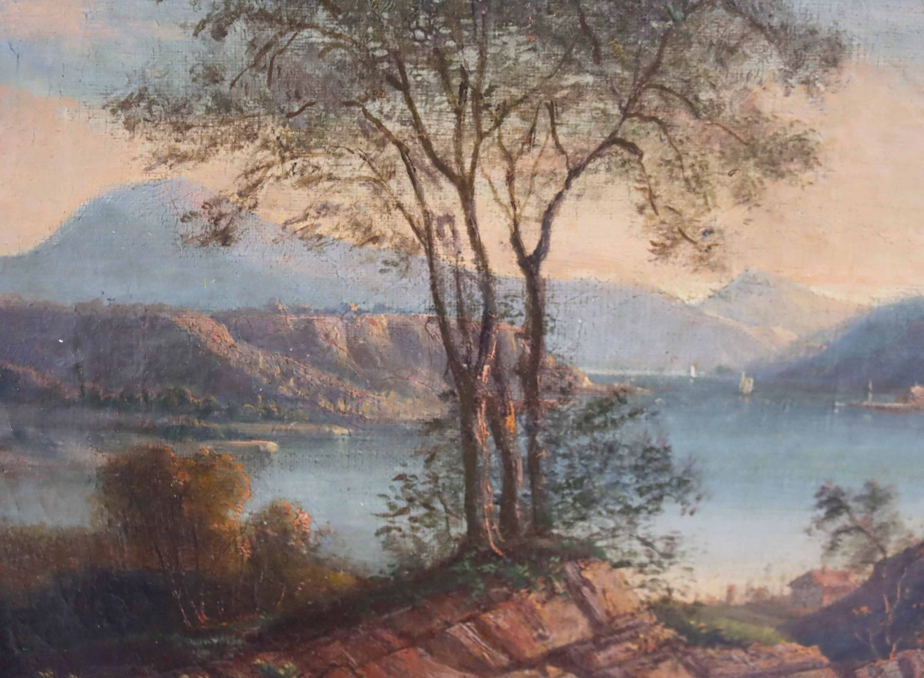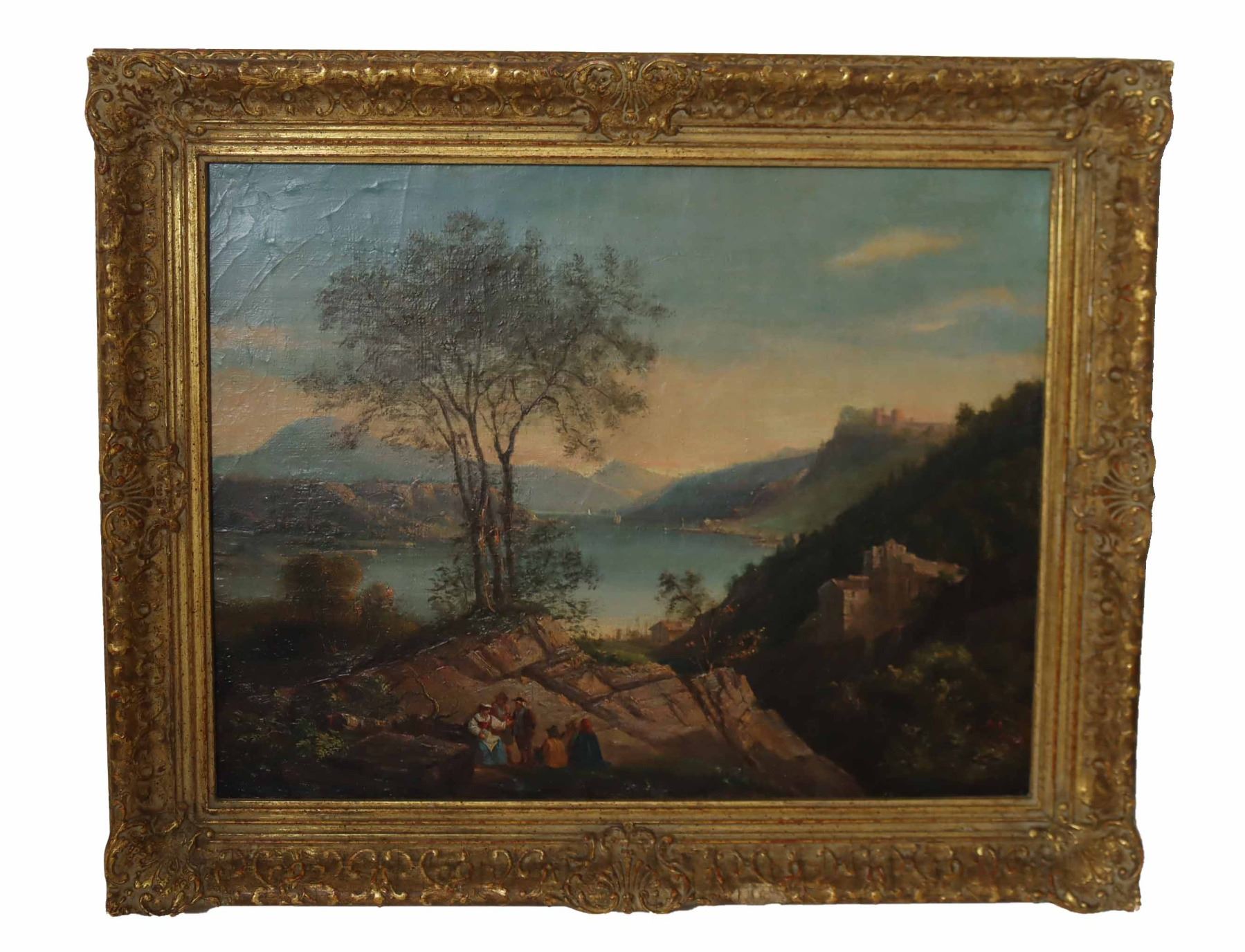 Italian coastal landscape with several figures in the foreground and ruins in the background. Painting has been relined. Appears to be unsigned.