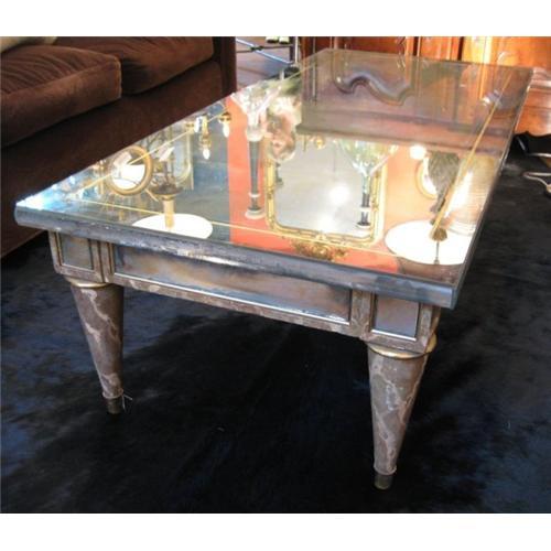 Beautiful Italian coffee table with mirrored top and marbleized details on legs and apron.</em></td>