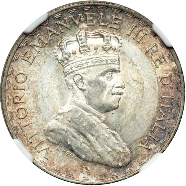 Italian Colonies - Italian Somaliland. 10 Lire, 1925-R. KM-7 (incorrect value on holder); Pagani-990. Vittorio Emanuele III crowned bust right. Choice and rare. NGC graded MS-64.