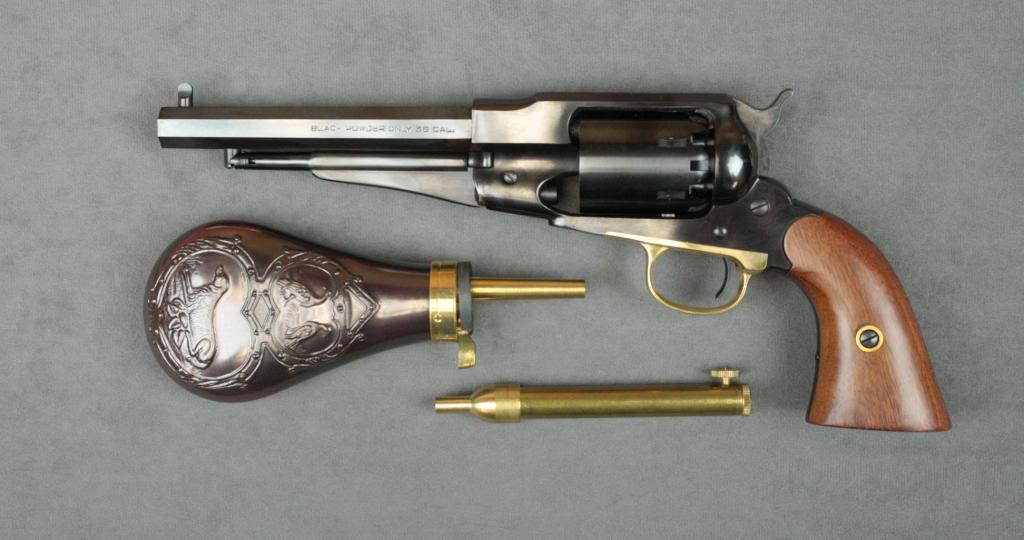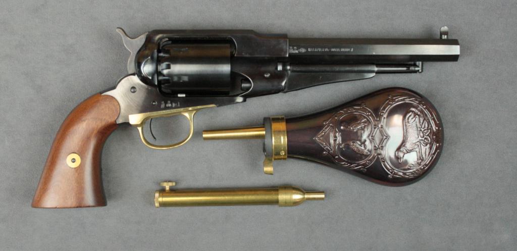 Italian Copy of a Remington New Model 1858 percussion revolver, .36 cal., 6-1/2” octagon barrel, black finish, wood grips, #158491. This gun is in overall like new condition; accompanied by a repro Remington style powder flask and brass powder measurer. Est.: $150-$300.