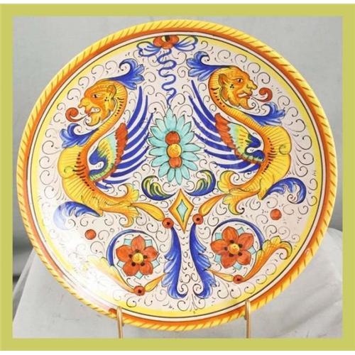 </STRONG>Title: 1950 Italian Deruta Plate Assisi Raefellesco Hand-Painted</STRONG><P>Item #: 6-336-0</P><P>Comment: Bright colors make this a cheerful addition to your collection!</P><P>Condition: In perfect condition!</P><P>Dimensions (in.): 12L 12.25W 1.75D </P><P>Age (ca.): 1950</P><P>Origin: Italy</P><P>Style: Deruta</P><P>Material: Ceramic</P><P>Object: Plate</P><P>Mark: Assisi</P><P>Subject: Raefellesco</P><P>Additional Detail 1: Hand-Painted</P><P>Piece Type: Majolica</P><P>Special Message: Because EuroLuxAntiques maintains its own website and lists on other online sites, while also operating a physical store location in Newberry, South Carolina, we reserve the right to end any listing early if no bids have been placed. However, once a bid has been placed, we give our online auction buyers priority and allow the listing to end as scheduled. Because of this, we encourage all of our buyers to place bids early so that your treasured find doesn't sell elsewhere to someone else. Happy bidding and thanks! Aimee & Greg Talbot at EuroLuxAntiques</P> #NTR# Italian Hand-Painted Assisi Raefellesco Plate Faience Deruta Ceramic