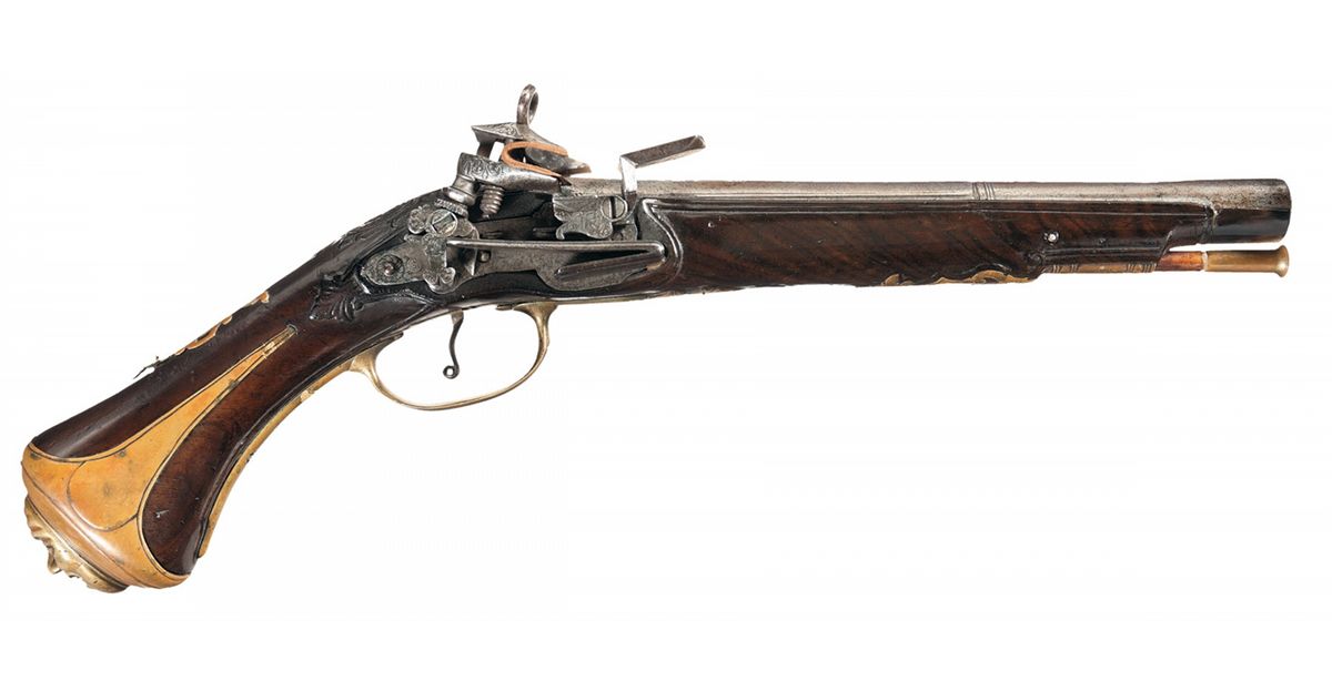 Manufactured possibly in the late 17th Century in Italy. No makers marks with a 9 3/8 inch barrel with the rear 5 1/2 inches semi-octagon. Floral scroll engraving on the action parts, brass mountings and mounted with a walnut stock with a horn forend, carving on the rear of the flats and behind the barrel tang, brass overlays and brass butt cap with relief grotesque face. Provenance: The William Ashby Collection