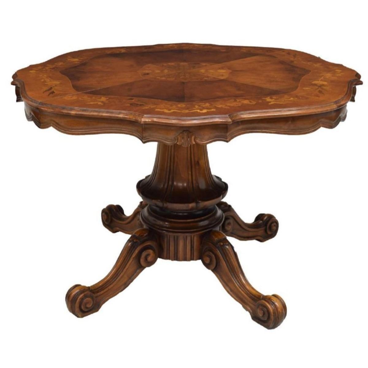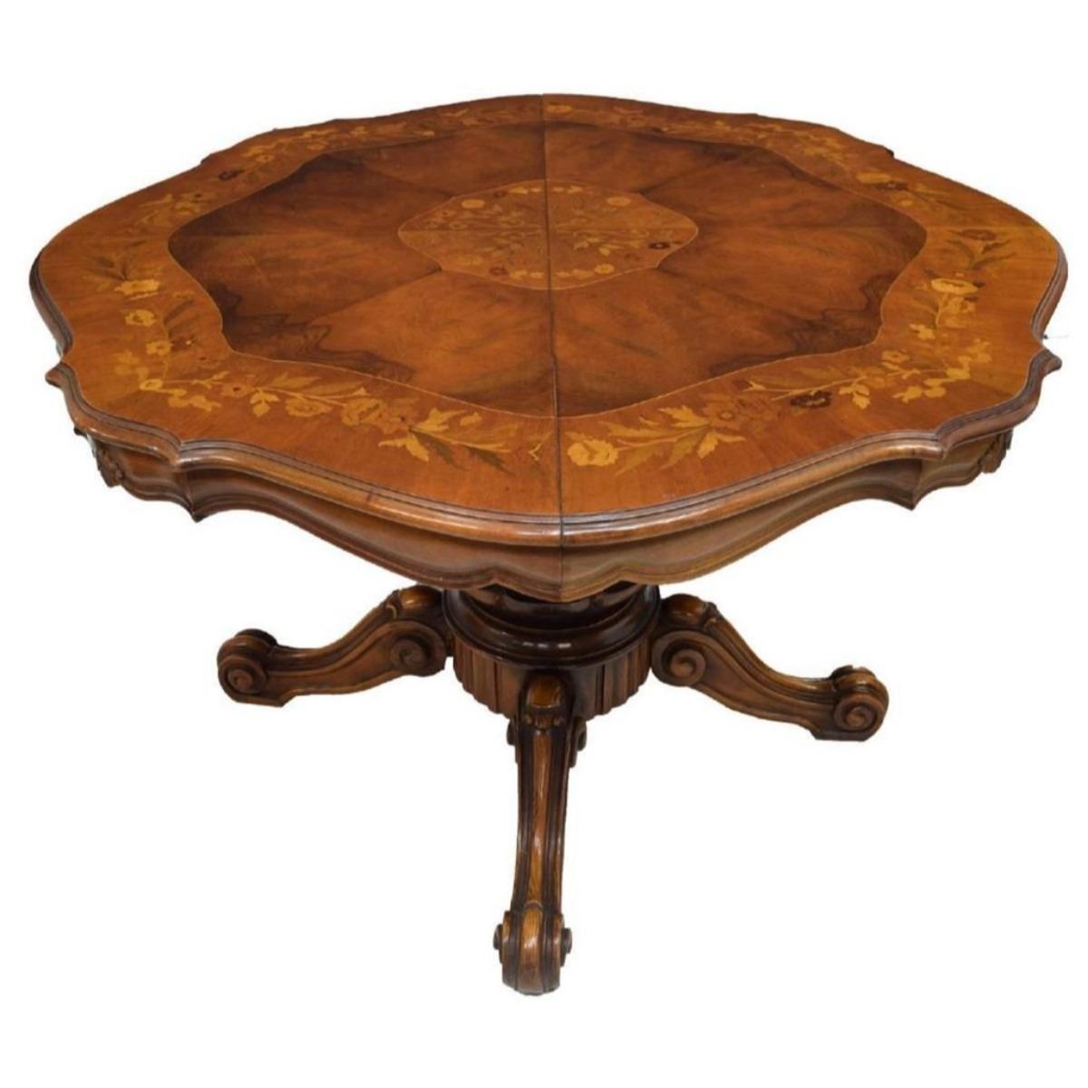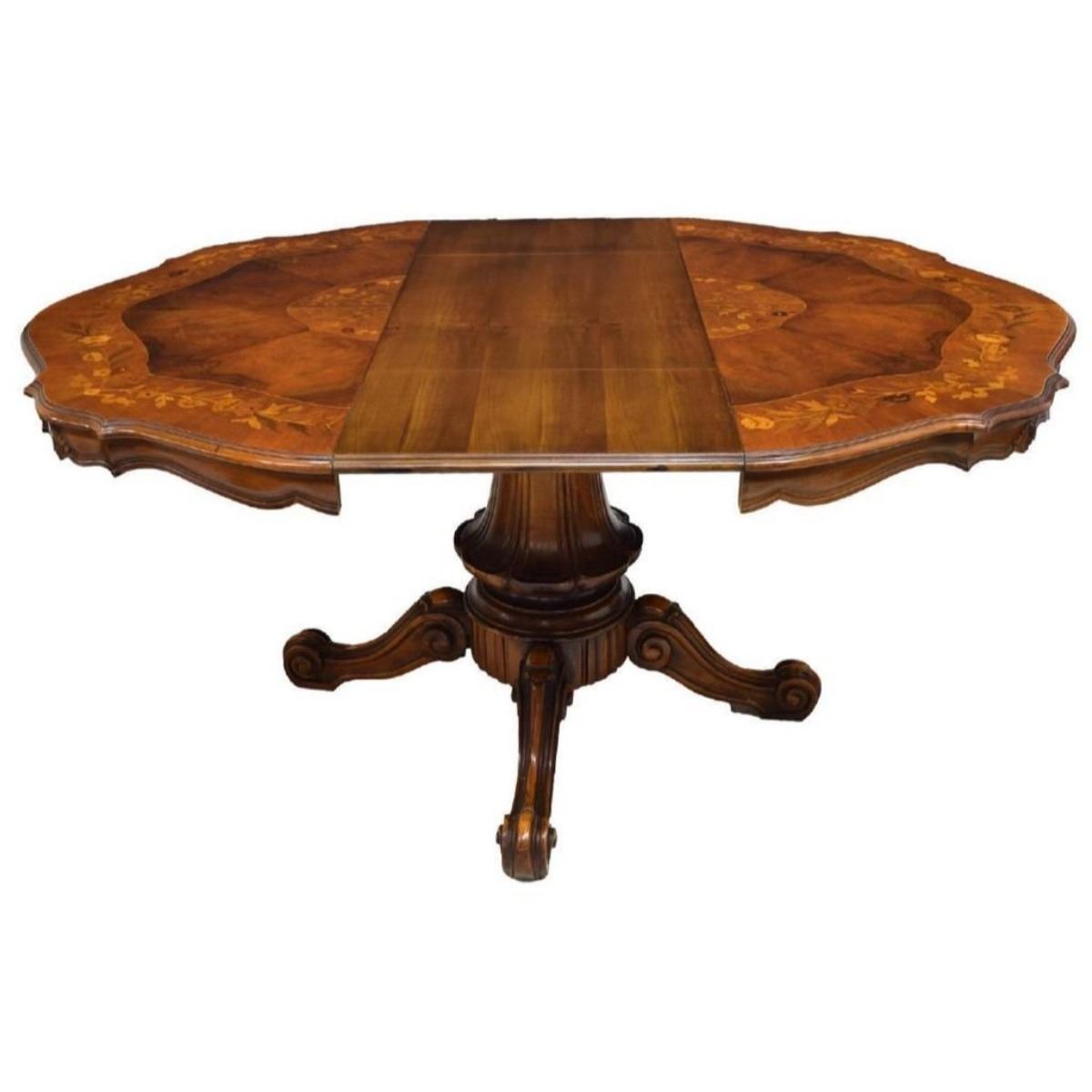 Italian dining table, 20th c., the shaped top having floral marquetry and molded border, accompanied by a single unfinished leaf, rising on shaped stem on four scrolled legs, approx 31"h, 48"w, 48.25"d, extended: 69"w - 10628-052018-LA-03151