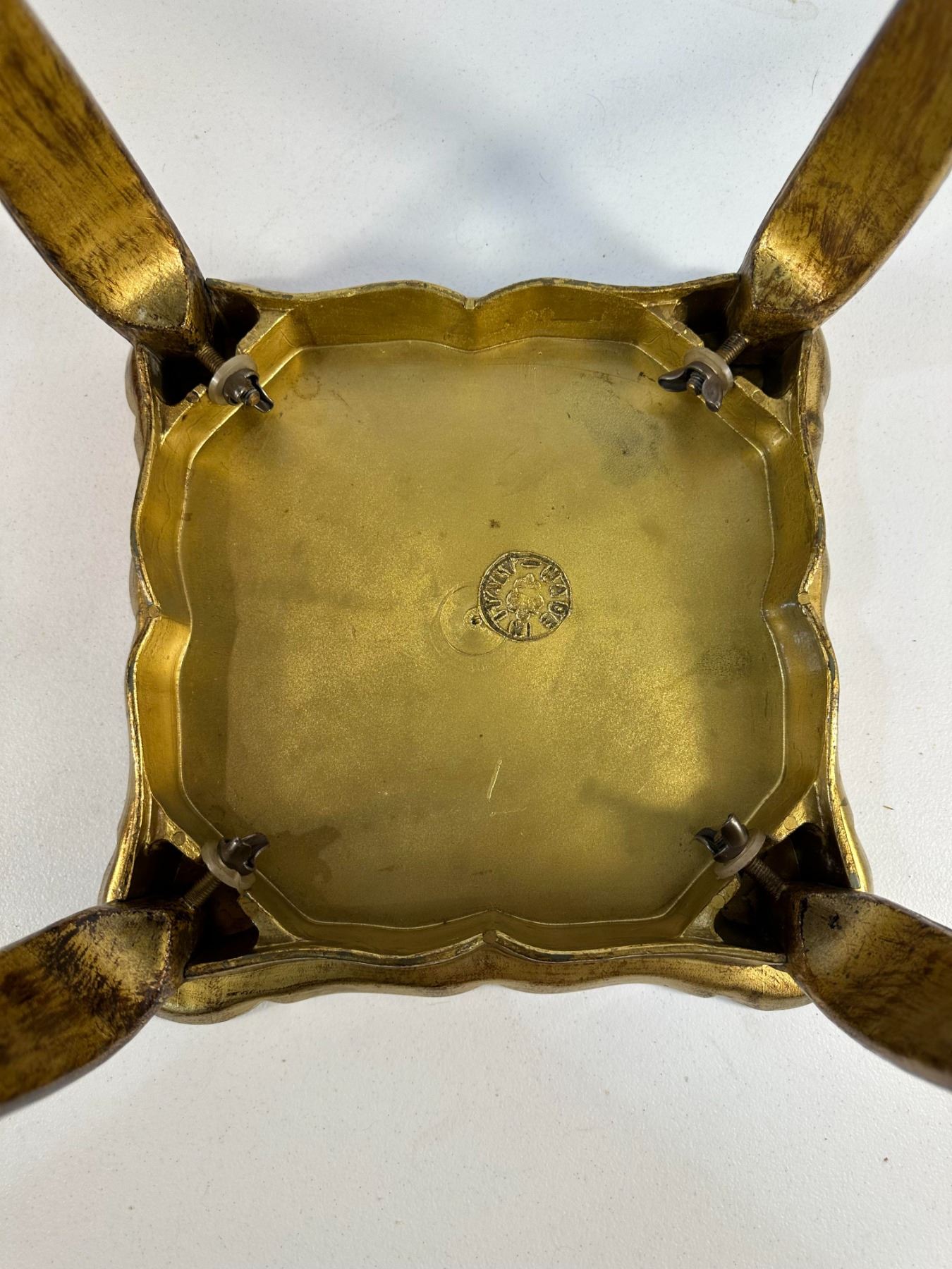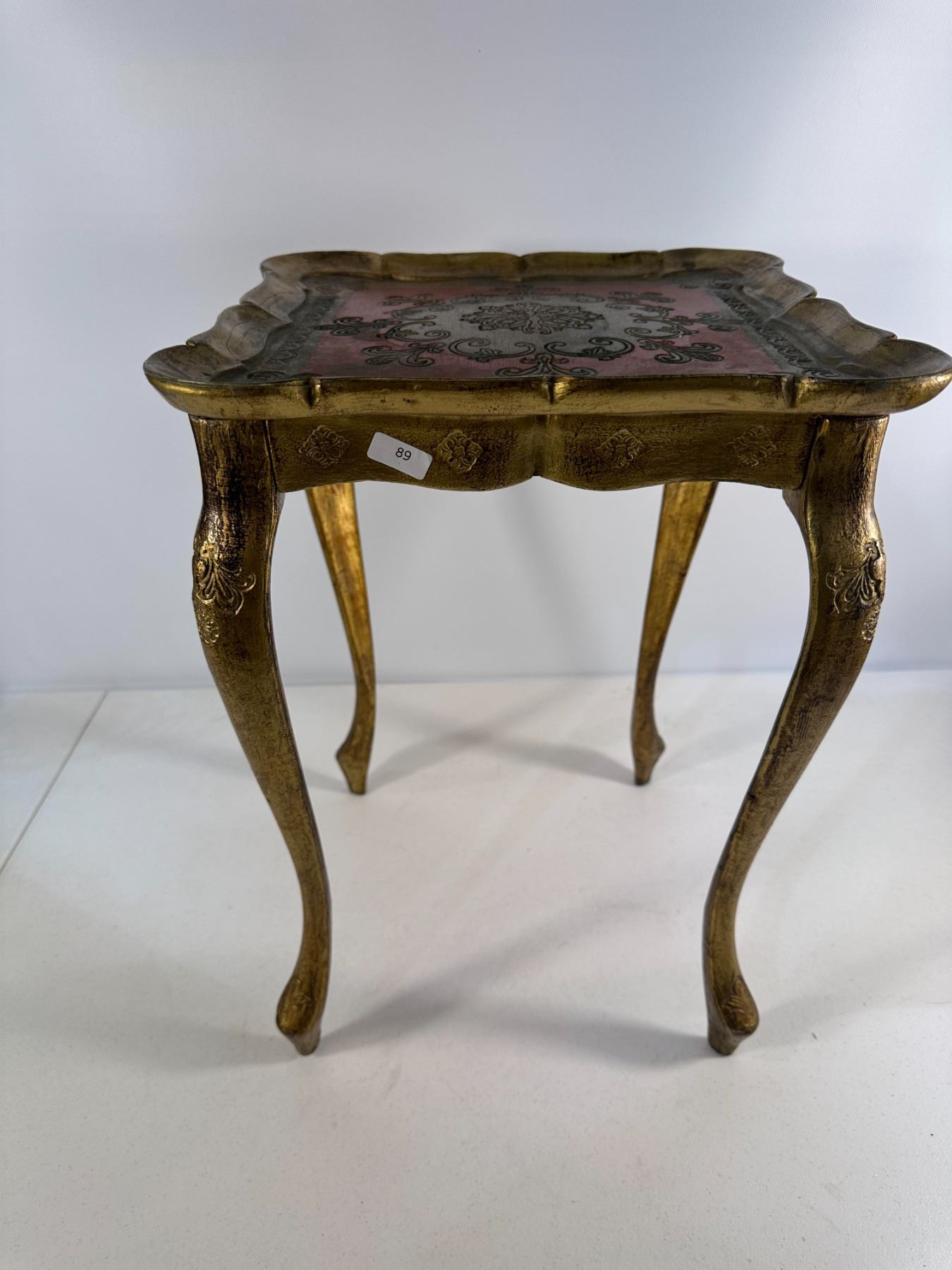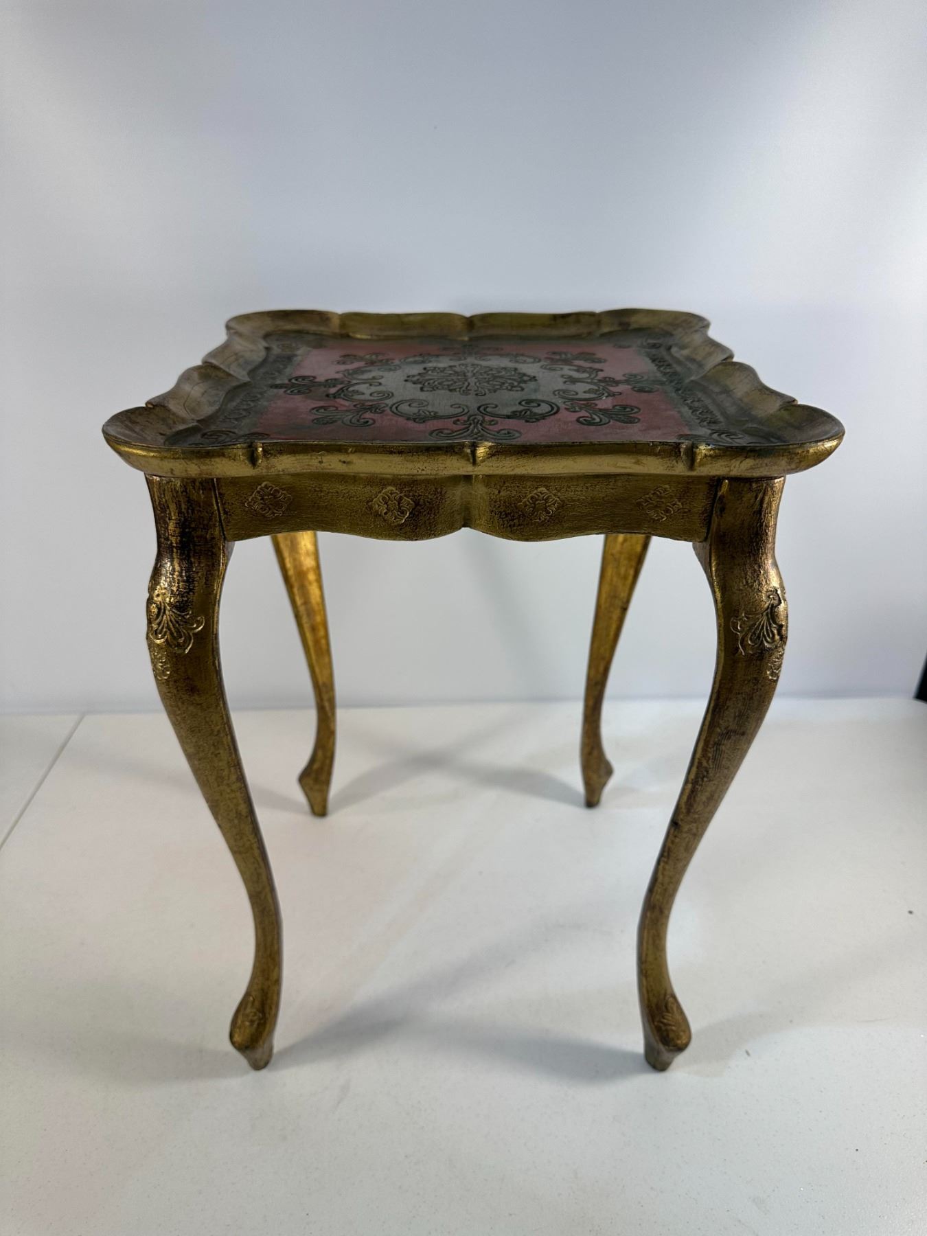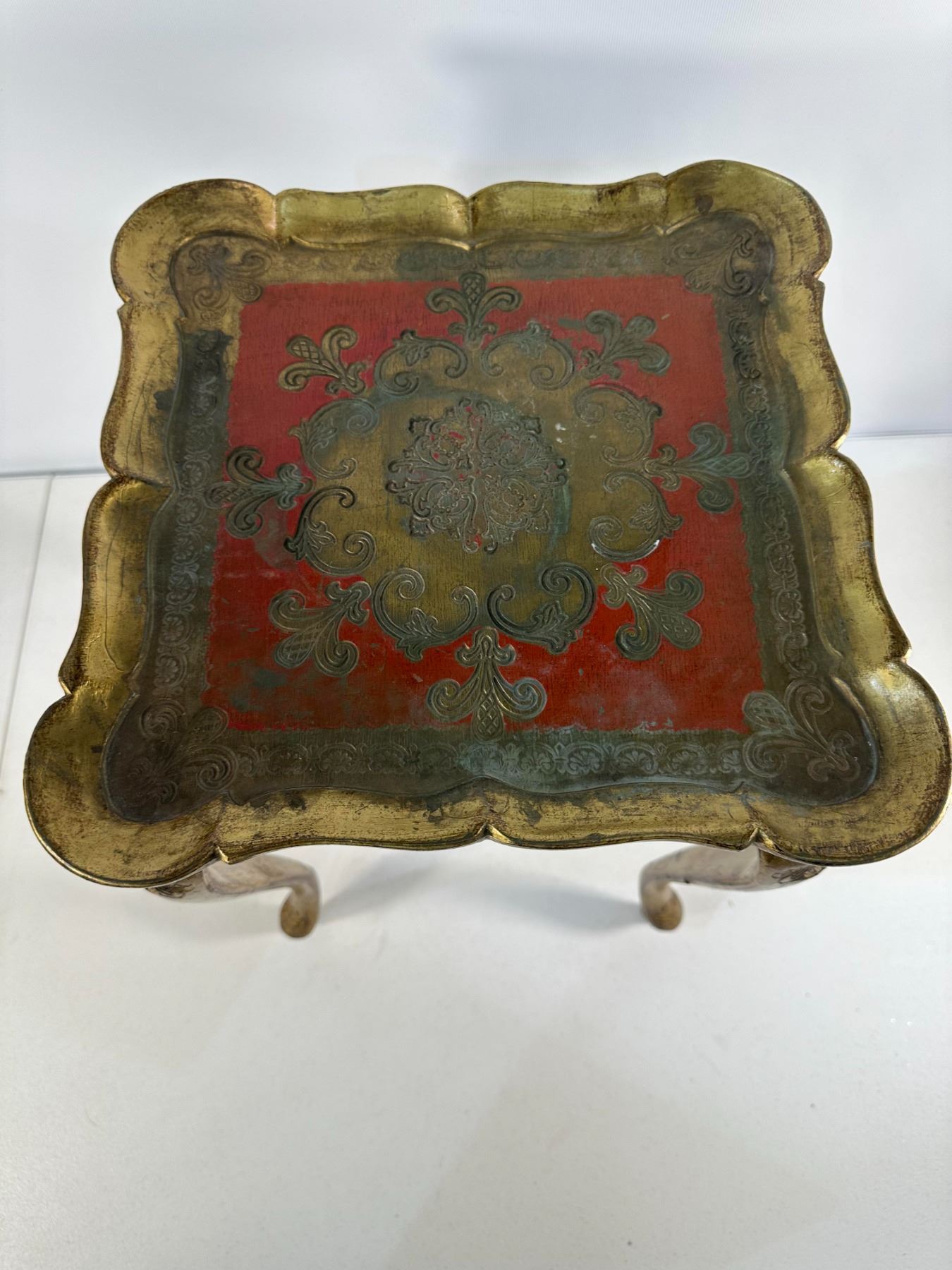 Elegant hand-painted Florentine-style side table featuring gold gilt finish with ornate floral and scrollwork detail over a red background. Curved cabriole legs and scalloped edges add timeless European charm. Mid to late 20th century. Some light surface wear; overall very good decorative condition.