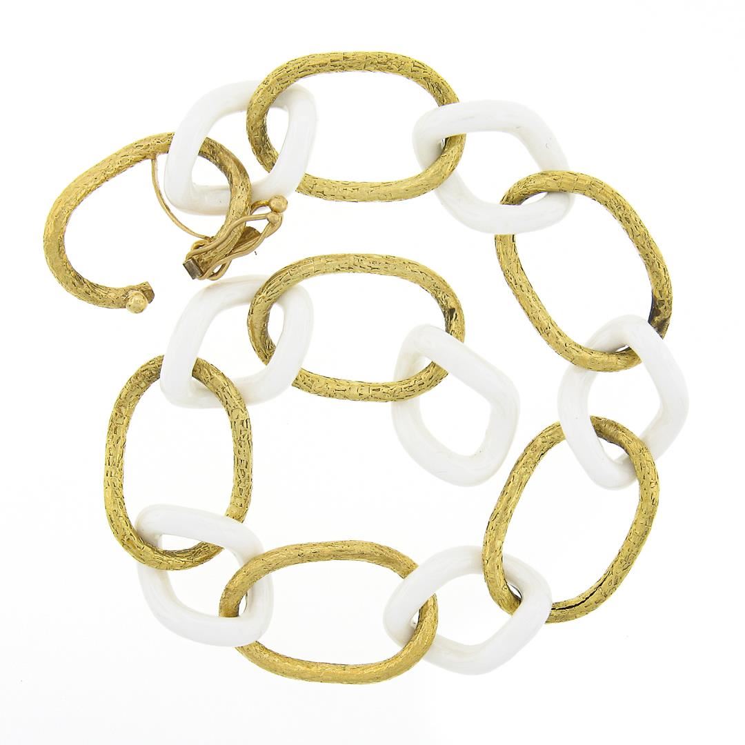 An italian solid 18k yellow gold & white ceramic link bracelet by Giovanni Matchiso. It weighs a total of 19.53 grams, measures 14mm wide, and measures 6.5 inches in length.