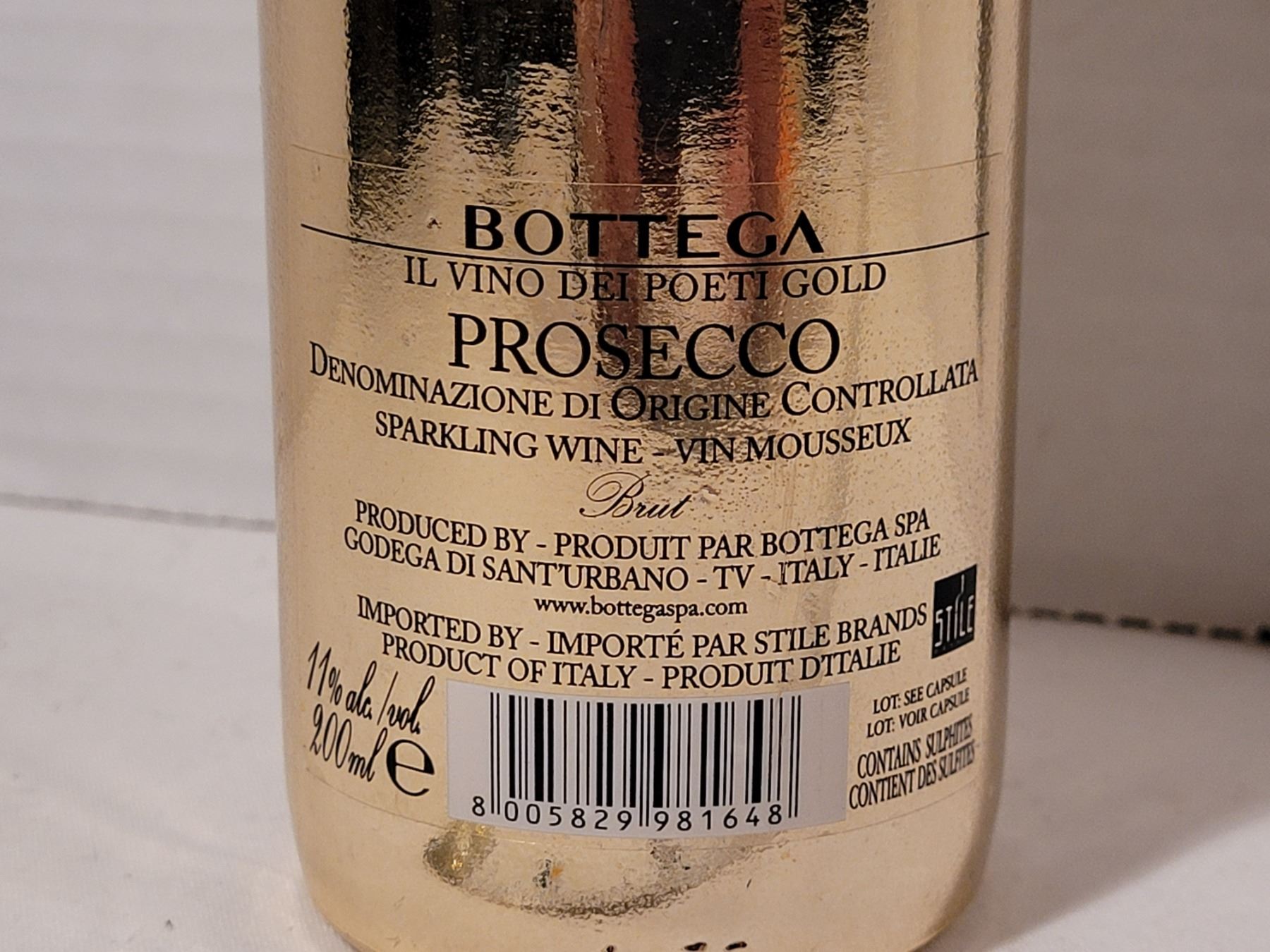 Italian Gold sparkling wine. Bottega Prosecco