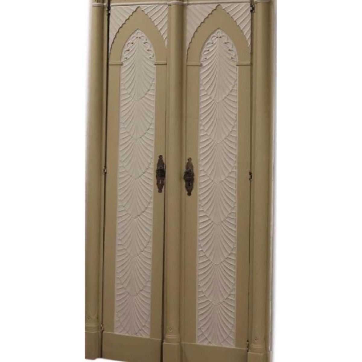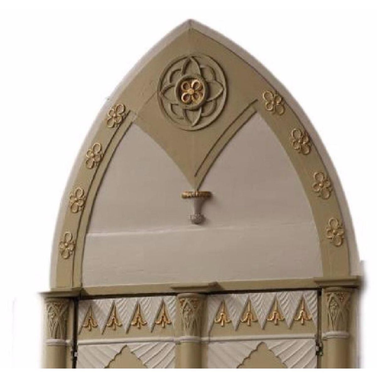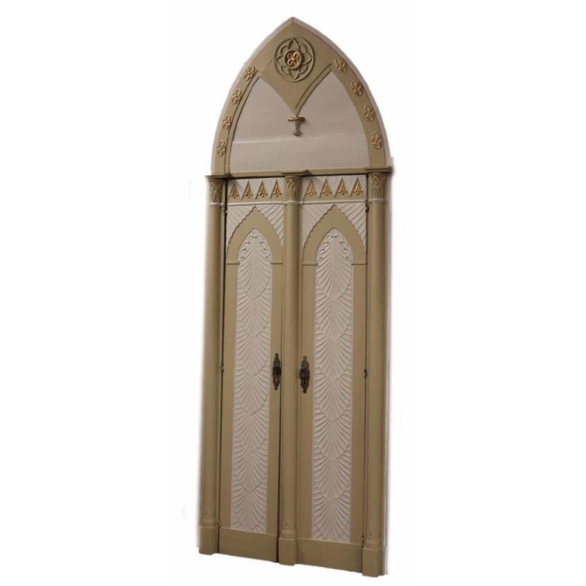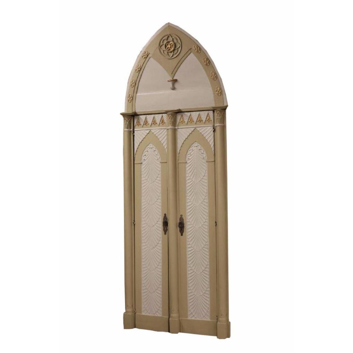 Italian Gothic Revival, painted & parcel gilt architectural doors, c. 1900, having quatrefoil & tracery decoration, along with the matching arched transom, accented with centered & flanking half columns, the door panels with inverted leaf forms, hardware appearing as original, approx. 132" H, 48", W 4" D.