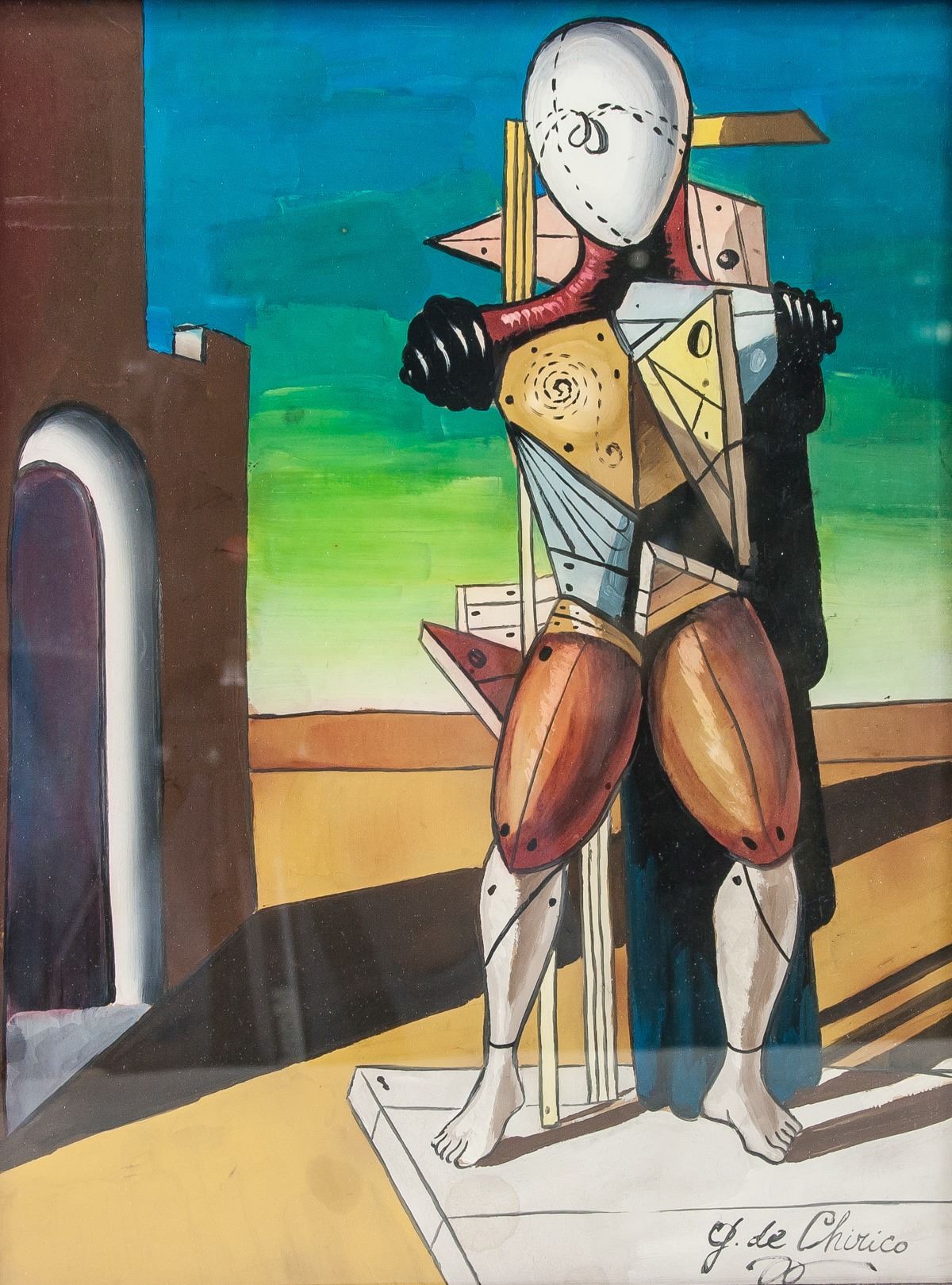 Gouache on paper, framed. Italian Surrealist School. Featuring a surrealist figure. Signed G. de Chirico, possible signature of Georgio de Chirico on the lower right corner. 27 x 21 cm (10.6 x 8.3 inches), frame: 31 x 25 cm (12.2 x 9.8 inches). PROVENANCE: Southern Ontario estate.