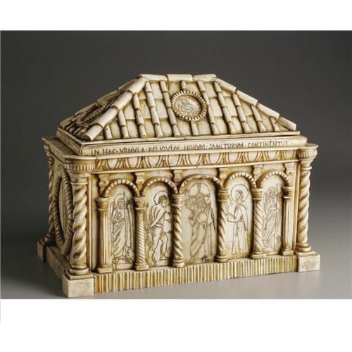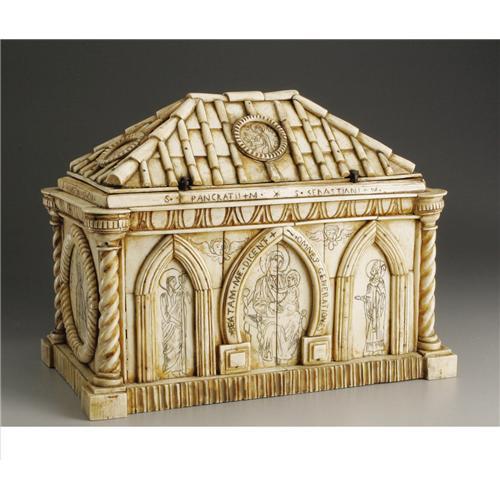 <B>AN Italian Grand Tour Carved Bone Reliquary Casket</B></I><BR><BR>Unknown maker, Italy<BR>Eighteenth Century<BR>Bone and wood<BR>Unmarked<BR>8.75 in. x 11.37 in. x 6.25 in.<BR><BR>In temple form, with medallions of the four evangelists on the cover; Christ, angels and martyrs around the body, with Latin inscriptions, wood frame<BR>Paper label on base: Ivory Reliquaire / bought at / Hotel de Londres / La Cava Italy / 21 February 1908 / E A …1 <BR><BR><B>Condition Report:</B> Wear commensurate with age and some old repairs
