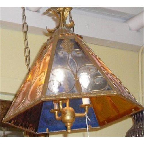 This is a wonderful multi-colored Italian chandelier with amber,cobalt and amethist colored glass panels and four interior candlestick lights. It is wired for USA use.