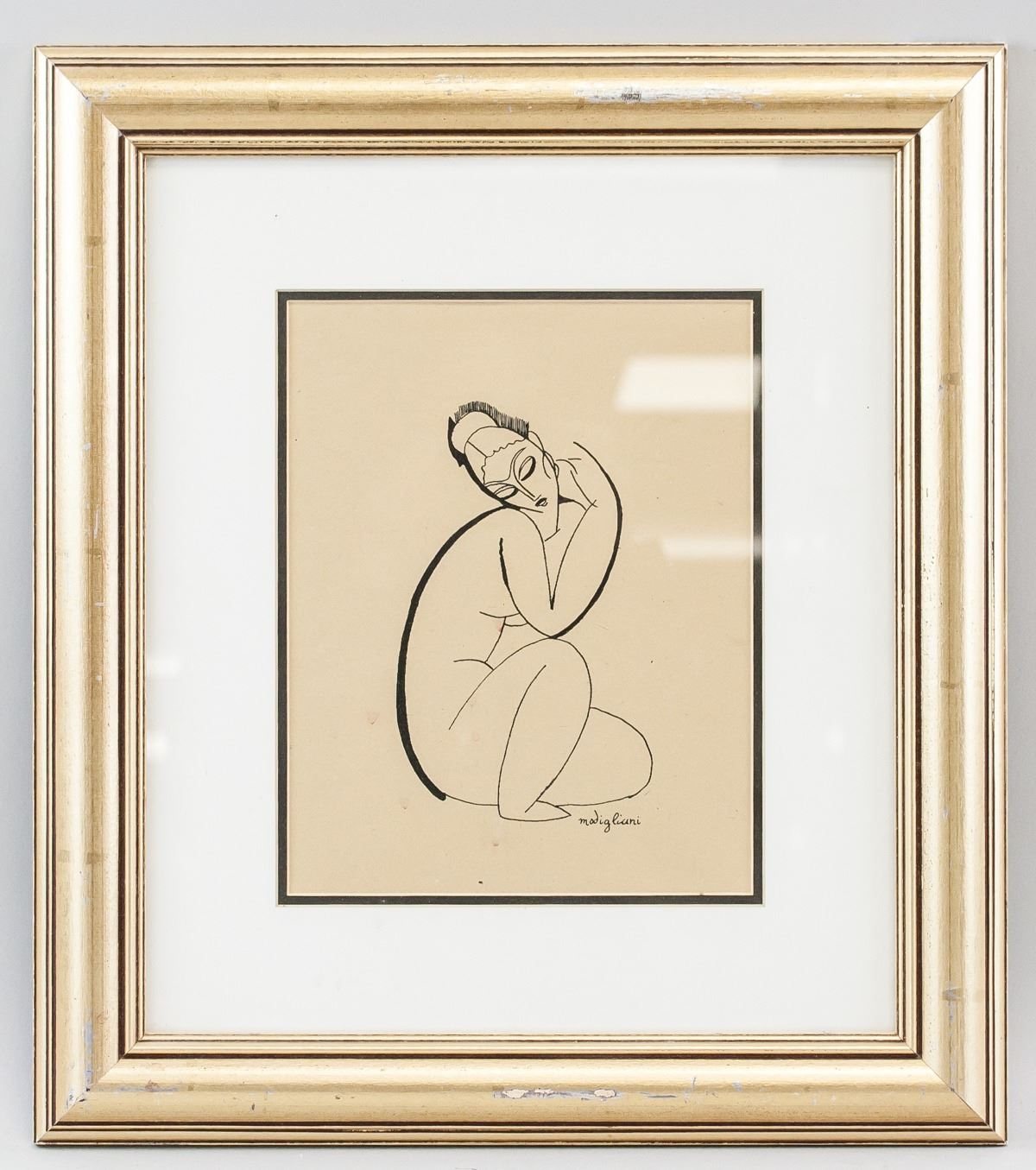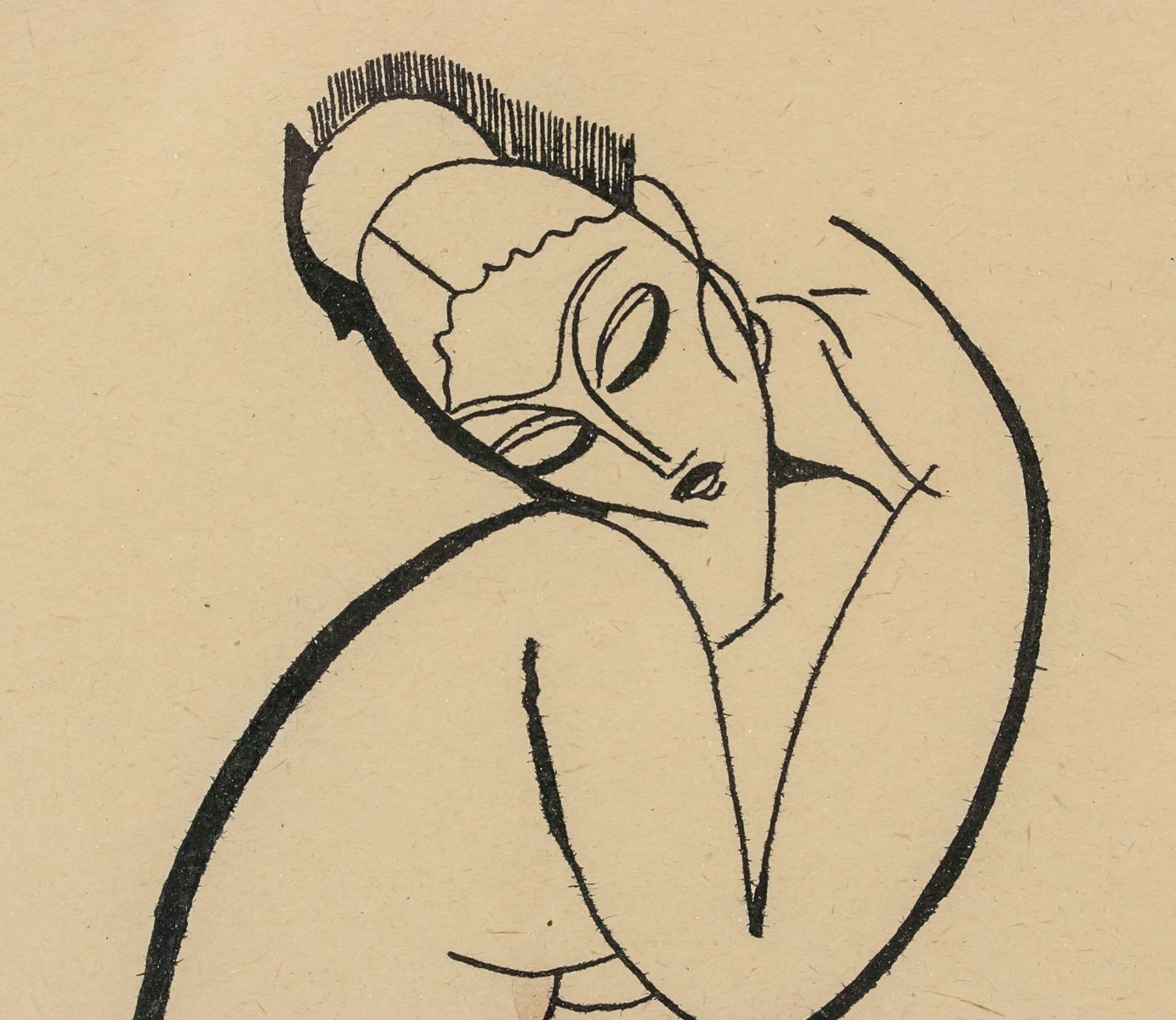 Ink on paper, framed. Featuring portrait of a woman sitting in a curled position. Signed "modigliani" near the figure's foot. 24 x 18 cm (9.5 x 7 in), Frame: 44 x 39 cm (17 x 15 in). Provenance: This lot carries limited provenance from a Private Ottawa Collection
