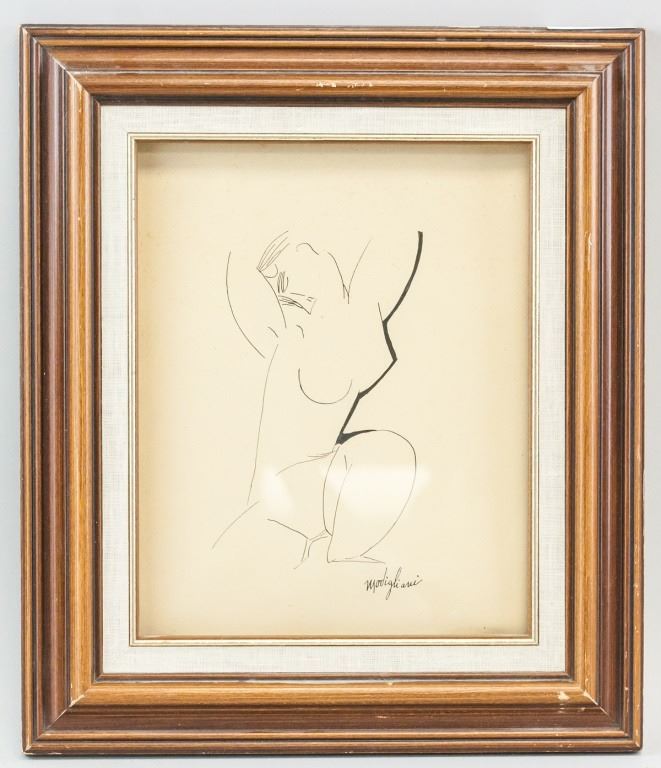 Ink on paper, framed. Featuring nude sketch. Signed "Modigliani to the bottom right. 24 x 19 cm (9.5 x 7.5 in), Frame: 36 x 31 cm (15 x 12 in).