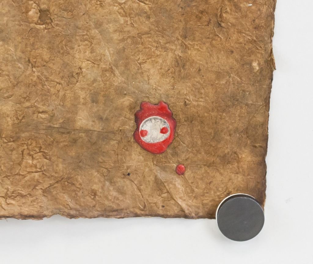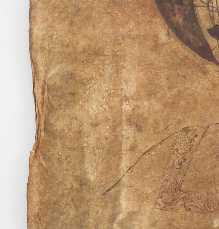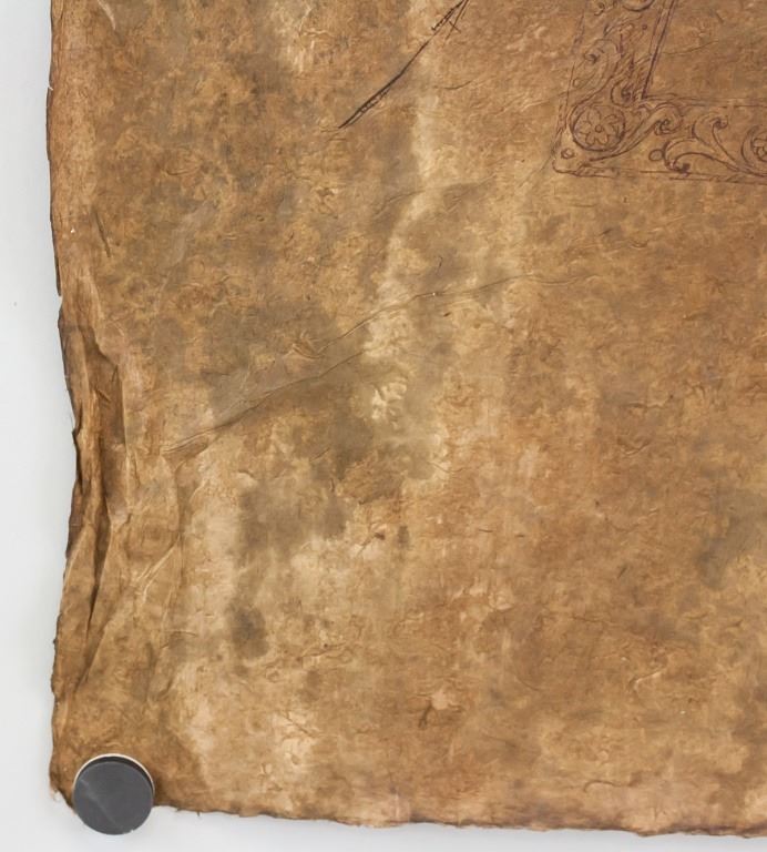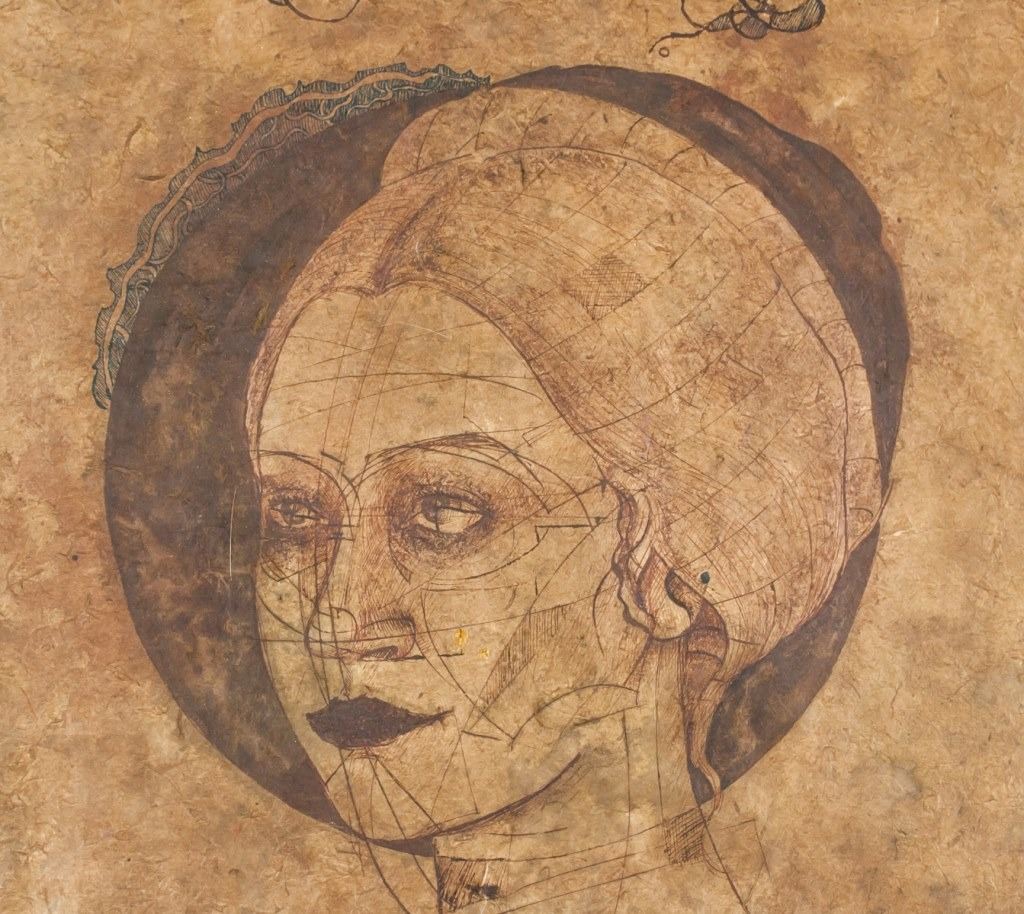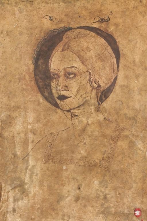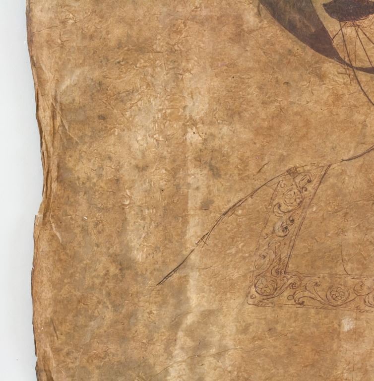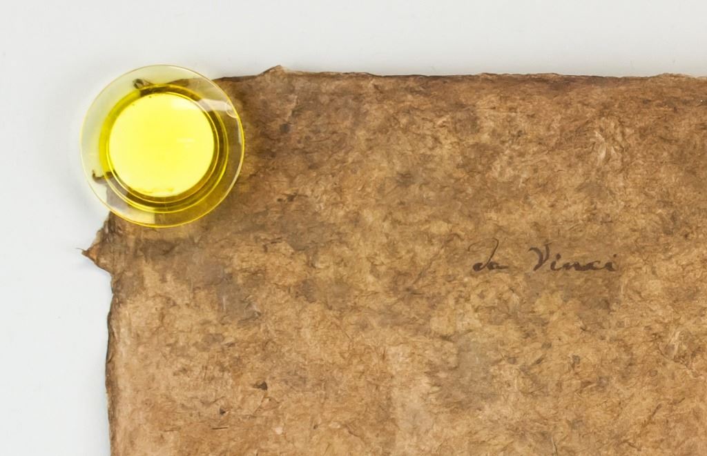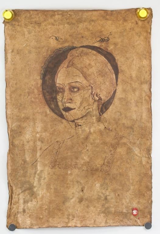 Ink on papyrus. Featuring portrait sketch of a woman. Signed "da Vinci" to the top left corner. Red seal to the bottom right. 74 x 50 cm (29 x 19.5 inches).