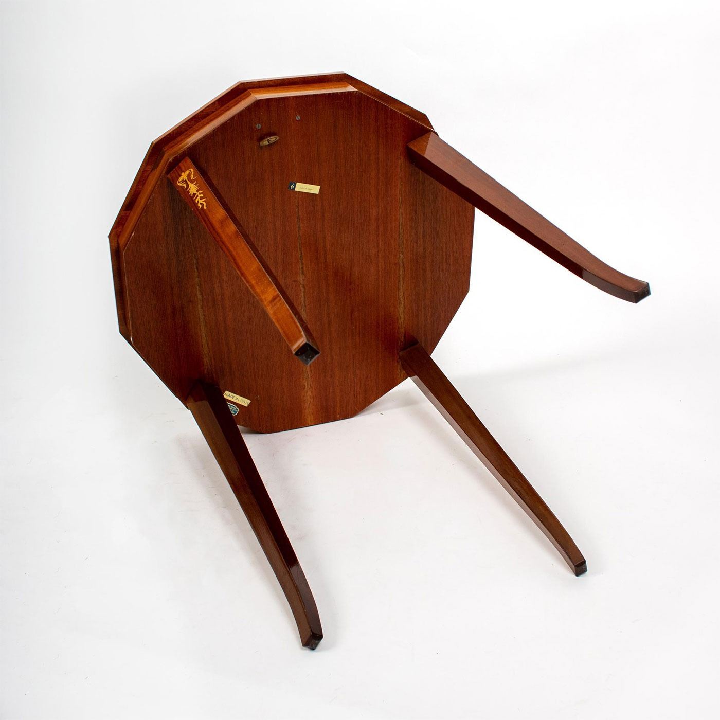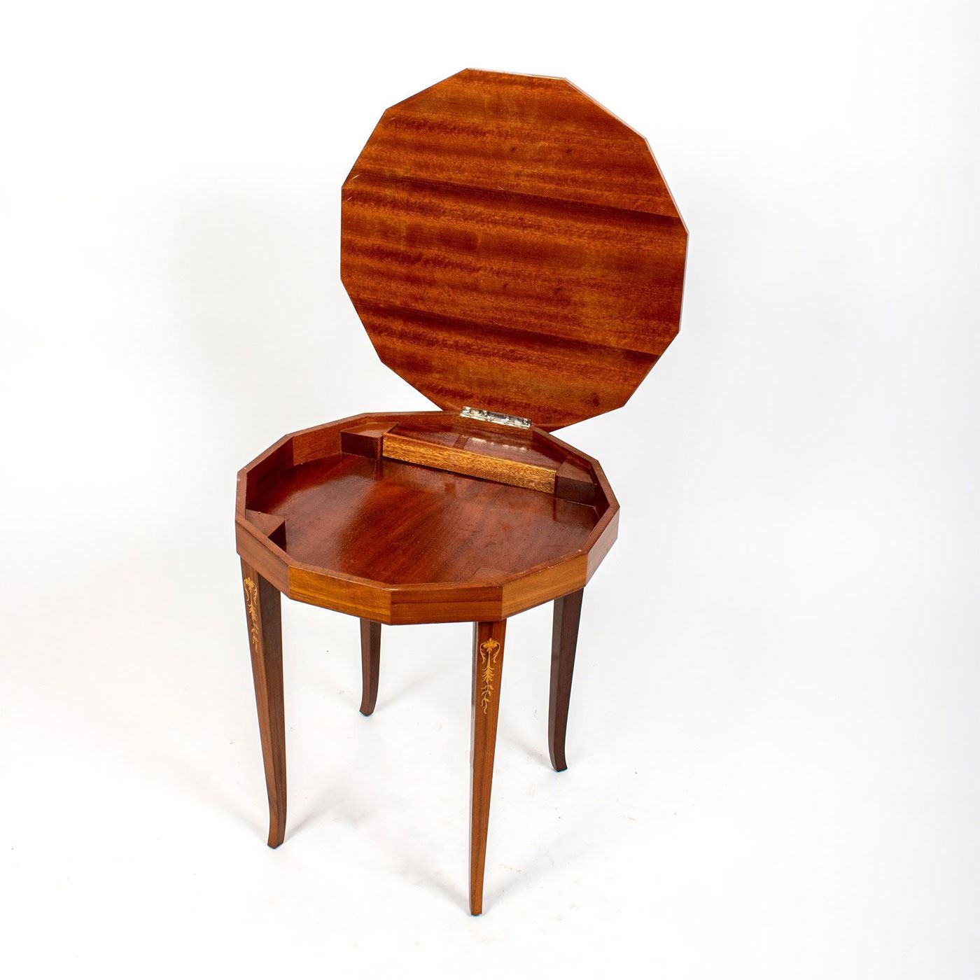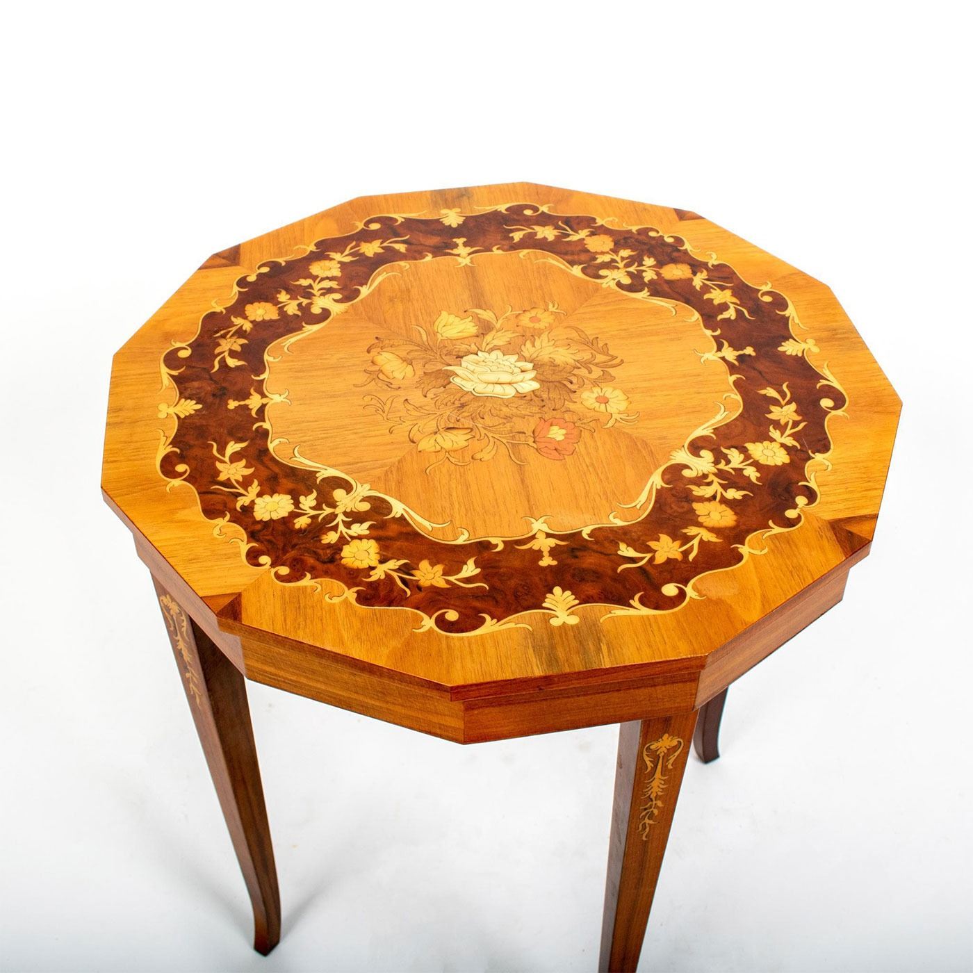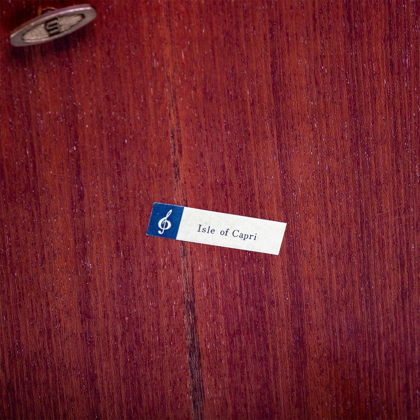Hand made wooden table with slender cabriole legs. Swiss movements and plays Isola di Capri. Exquisitely detailed floral and foliage design.