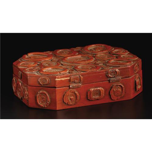 <B>An Italian Intaglio Seal Decorated Box</B></I><BR><BR>Unknown maker, Italy<BR>Early/Mid Twentieth Century<BR>Painted wood, resin<BR>Unmarked<BR>2.38 inches high x 8.38 inches wide x 6.5 inches deep<BR><BR>A souvenir of the Grand Tour, the rectangular red painted box with canted corners applied all over the form and on the interior cover with intaglio seal impressions in resin.<BR><BR> <B>Condition Report:</B> Cracks throughout, losses to resin, seal missing on left side.<BR><BR><b>Shipping:</b> Requires 3rd Party Shipping (<a target="_blank" href="http://www.heritageauctions.com/common/shipping.php">view shipping information</a>)