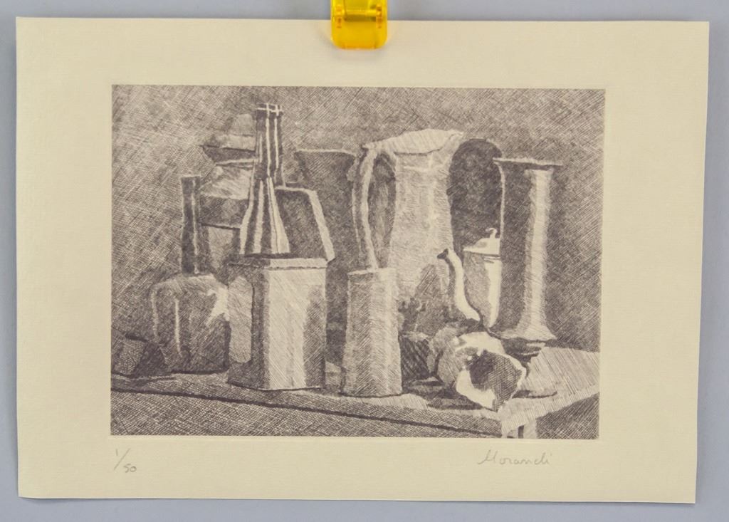 Lithograph on paper. Featuring still-life of bottles and cans. Signed "Morandi" to the bottom right. "1/50" inscribed to the bottom left. 21 x 30 cm (8.3 x 11.7 inch).
