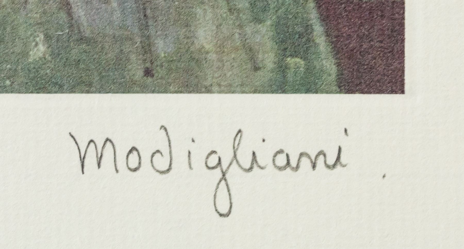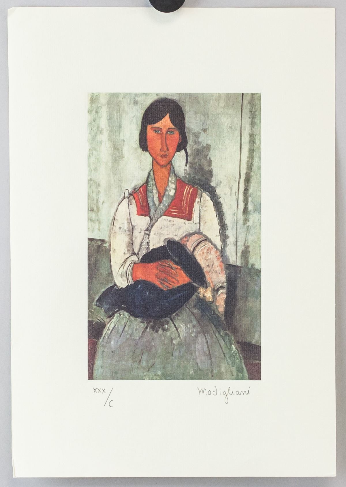 Lithograph on paper. Featuring a woman holding a child. Numbered "XXX/C" to the bottom left. Signed "Modigliani" to the bottom right. Plate size: 19 x 11 cm (7.25 x 4.25 inches). Sheet size: 30 x 21 cm (11.75 x 8.3 inches).