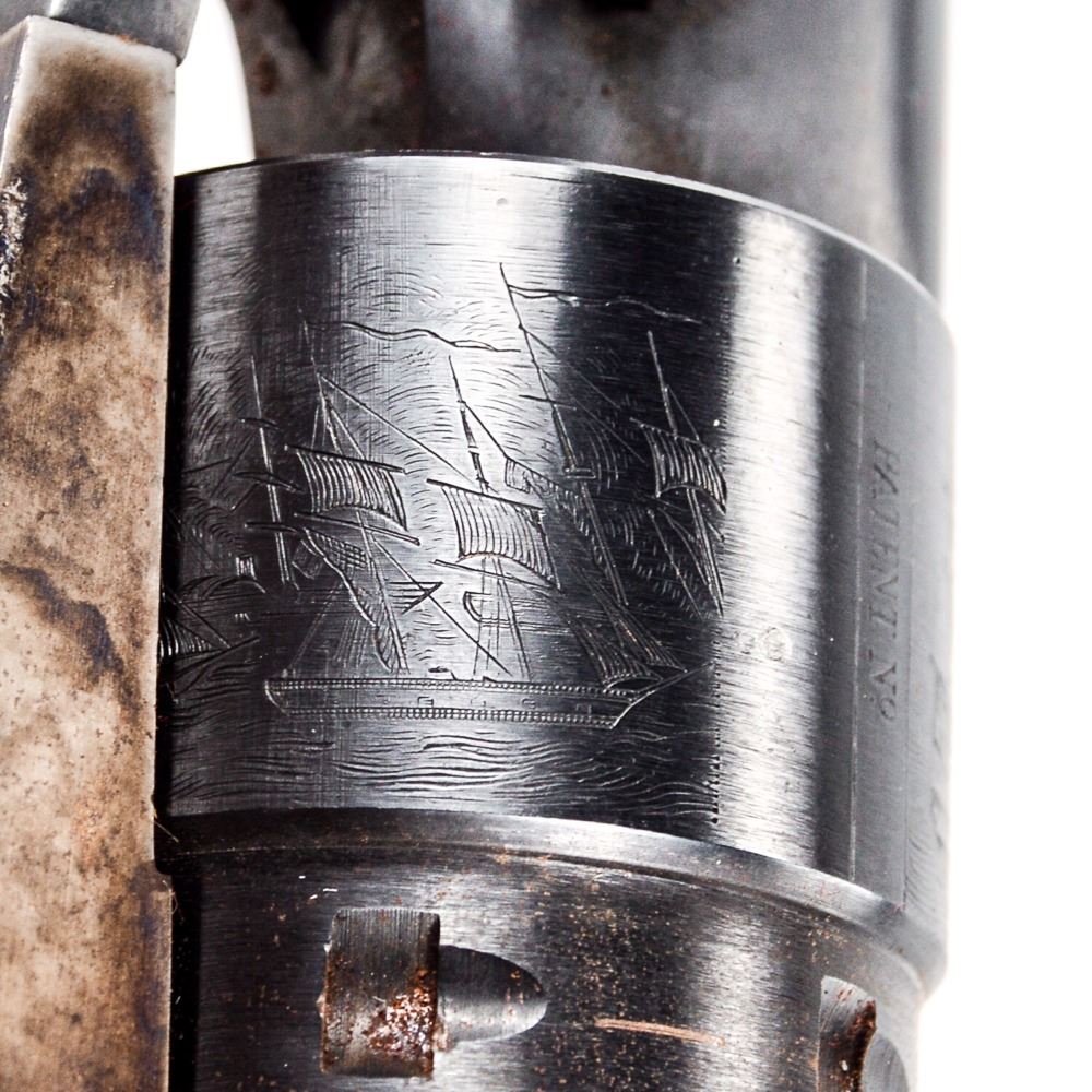 Italian MFG .44 Navy Revolver with wooden display box and powder flask and bullet mold. In excellent condition with very minor blemishes. S/n: E18947