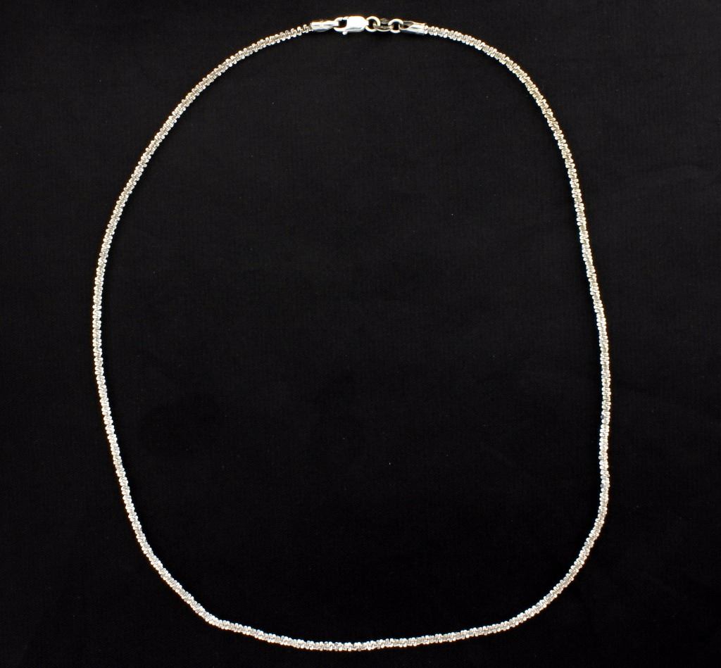 In 14K white gold, the chain is 2mm thick and has a lobster clasp. 4.5g
