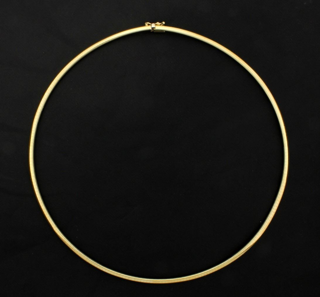 In 14K yellow gold the omega is 3mm thick with safety clasp. 17.5g