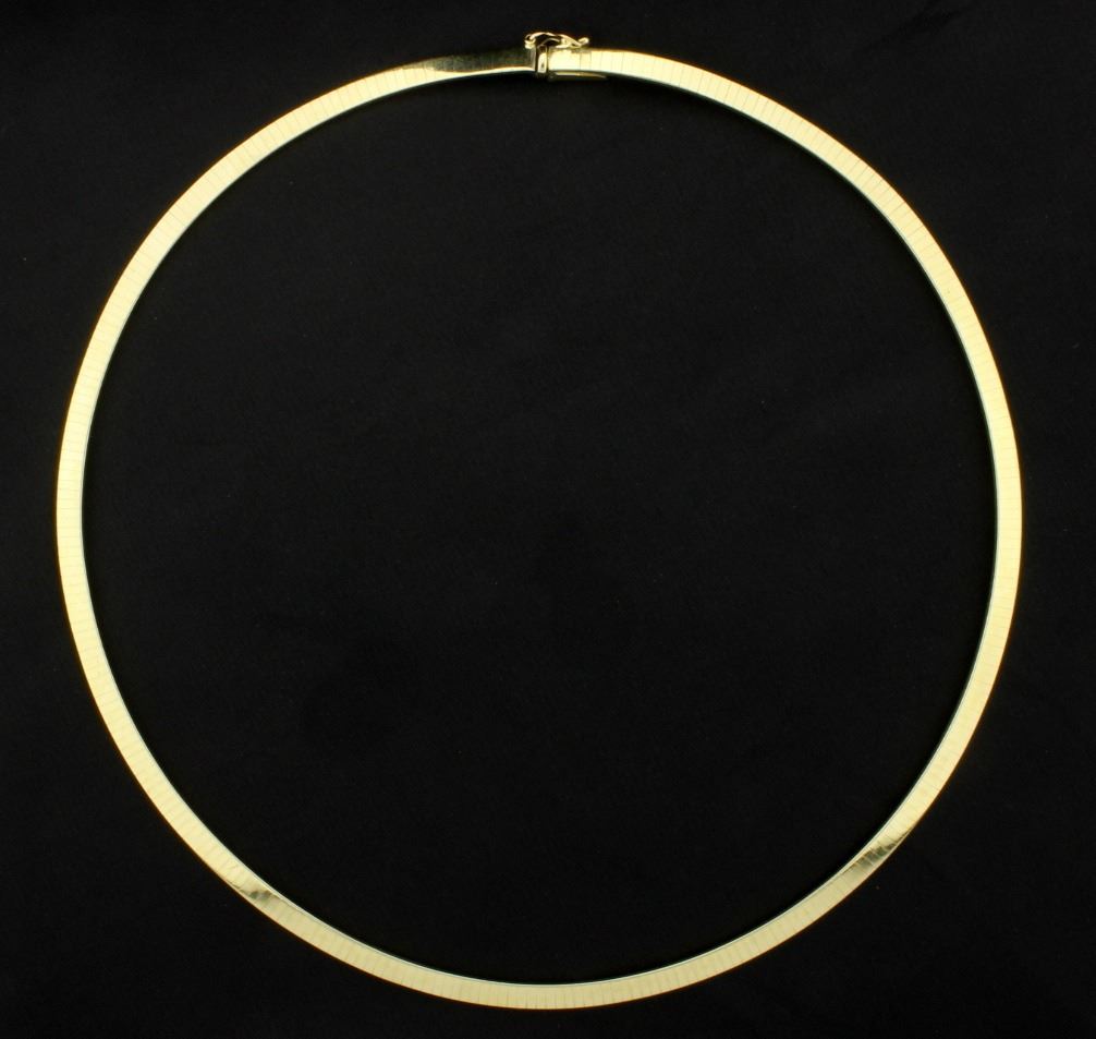 The omega is 14K yellow gold, and is 3.8mm wide, with a safety clasp. 25.1g