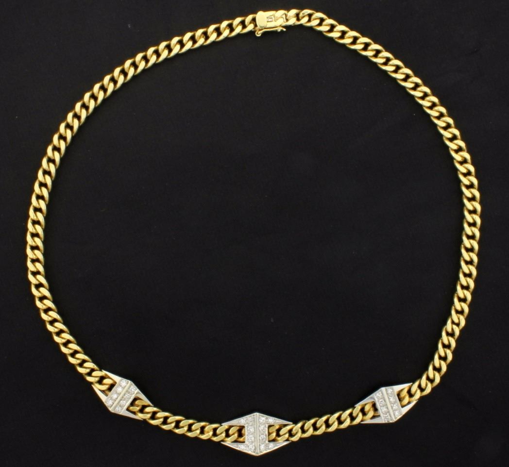 The 18K yellow & white gold custom designed necklace contains 1/2ct total weight of high quality VS clarity/F color diamonds. The chain is 5.3mm wide and 15.5 inches long and has a safety clasp. 45.7g